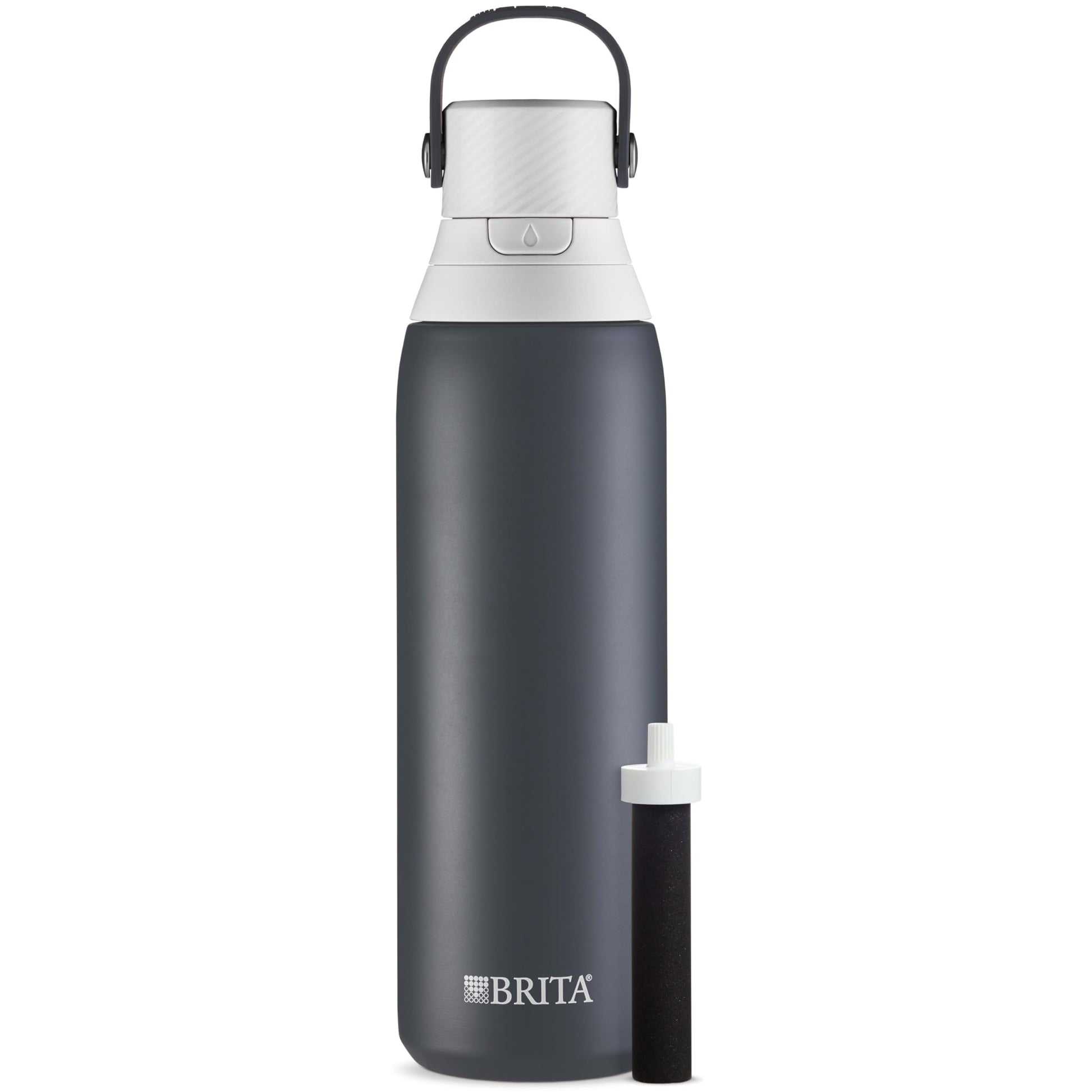Details: Drink healthier, great-tasting tap water with the BPA-free Brita Stainless Steel Premium Filtering Water Bottle. This durable, double-wall insulated filtered water bottle stays cold for a full 24 hours, making it fantastic for long road trips, all-day sports tournaments or office use. The Brita water filter bottle utilizes an activated carbon block filter to cut the taste and odor of chlorine and reduce particulates in water as you drink. You can also replace 300 standard 16.9-oz. single-use plastic water bottles with just one water bottle filter. It's an easy way to stay hydrated, save money and reduce plastic waste. Created for effortless convenience, this water bottle features an enclosed, easy-sip straw, a built-in carrying loop for grab-and-go portability and a one-handed push-button lid. A leakproof water bottle design helps you avoid surprise drips and spills. This water bottle is compatible with Brita water bottle replacement filters, which should be changed every 40 gallons or about every two months. Get great taste, less waste and more savings from Brita.
