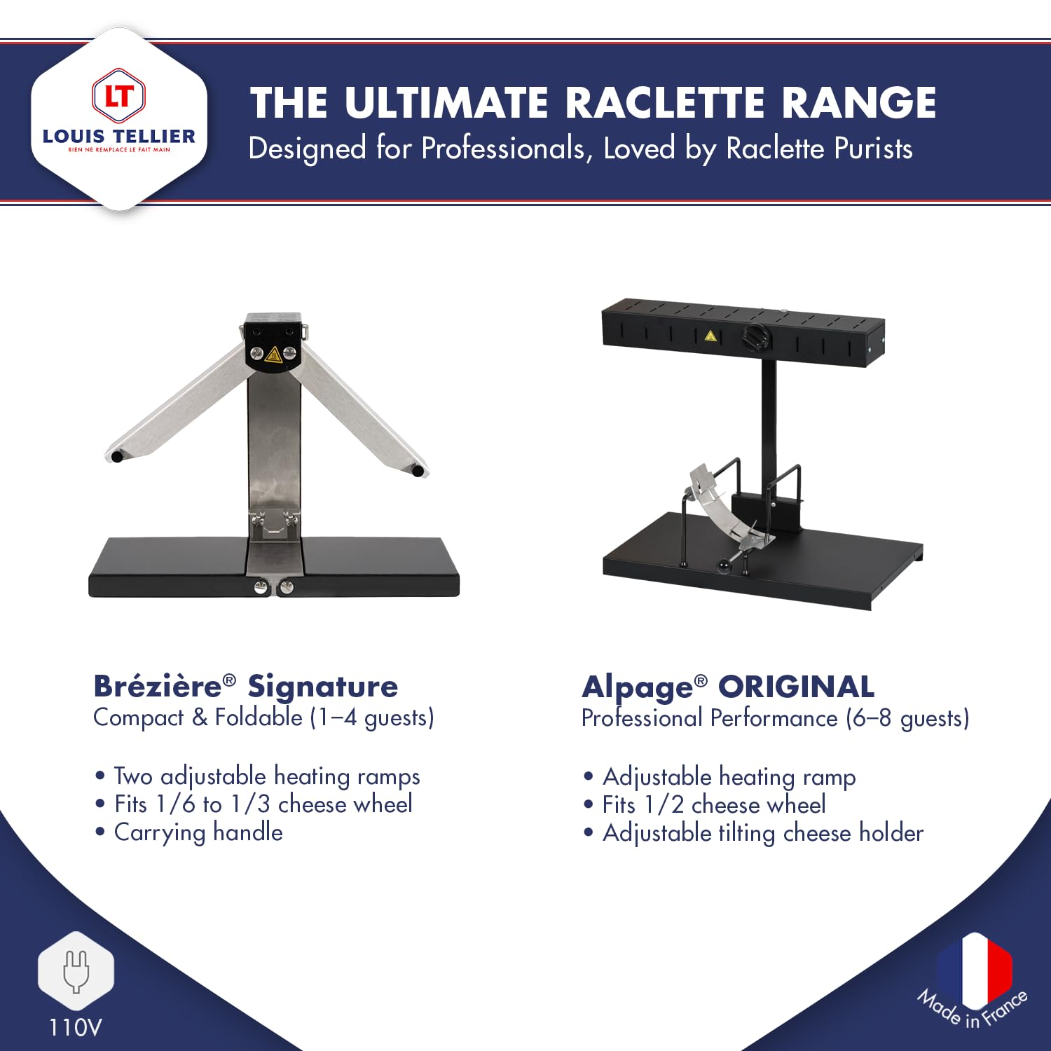 • TRADITIONAL RACLETTE MACHINE: The Brézière raclette machine allows you to suspend a portion of cheese wheel and heat it continuously for on-demand serving. With a power of 110V, it is ideal for a table of 1 to 4 guests.