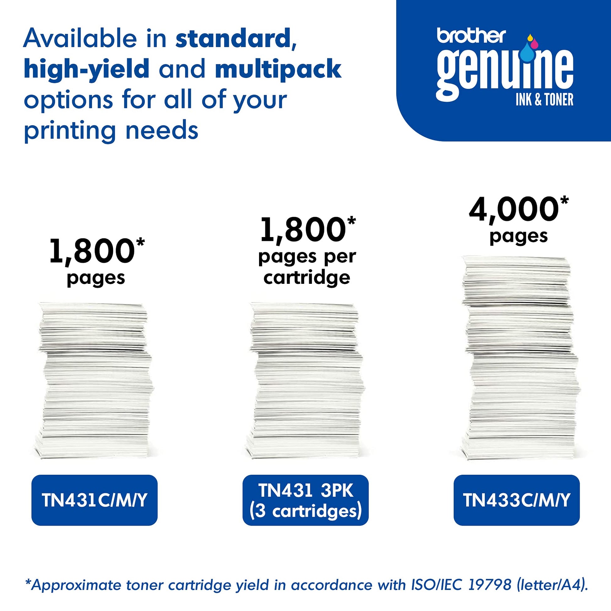 • Brother Genuine standard-yield color toner cartridge three pack TN431 3pk: contains one cartridge Each of Cyan, Magenta and Yellow toner that provides professional laser Print quality for up to 1, 800 pages per cartridge. (1)