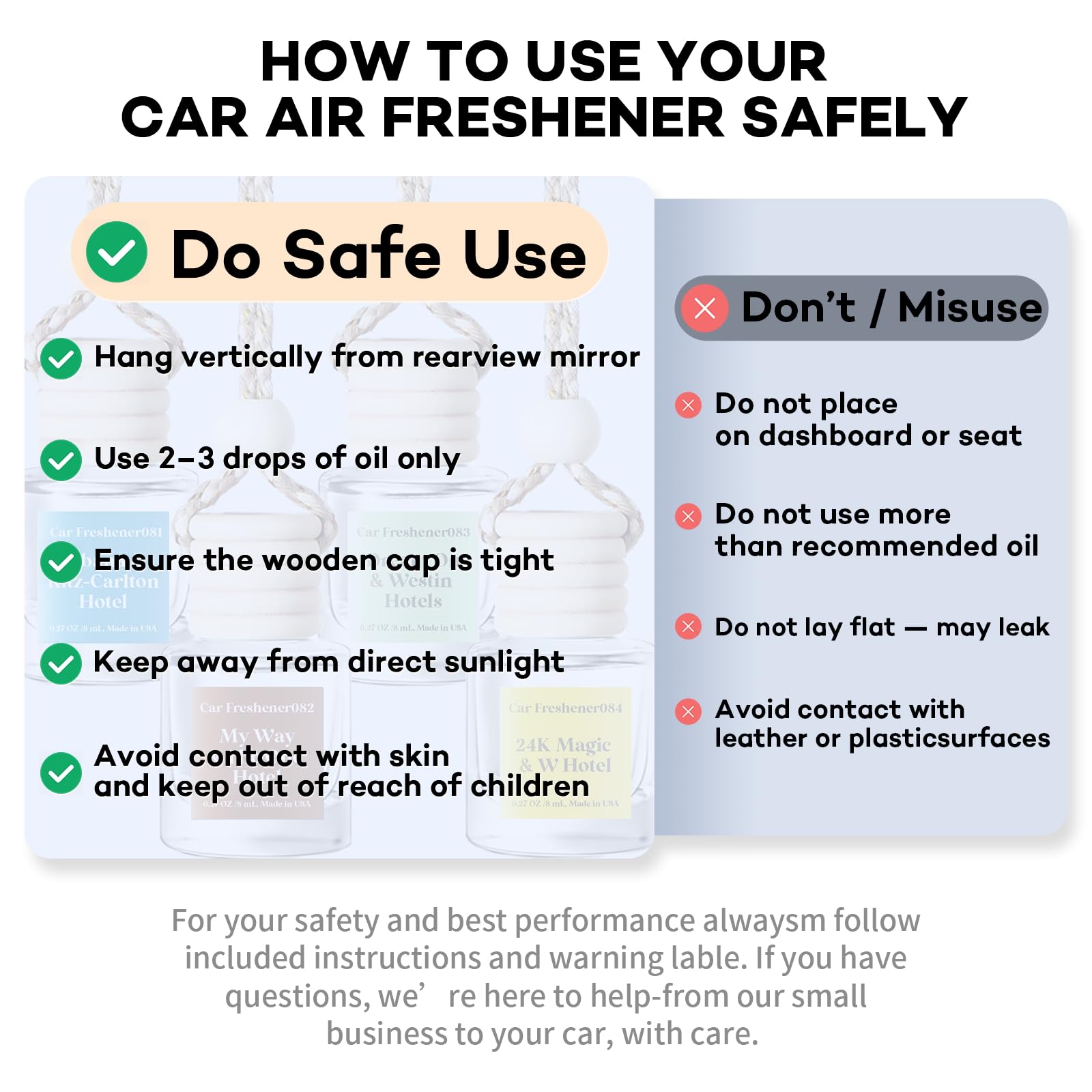 • 【Made in the USA】Our hanging air freshener is made right here in the USA from sustainably sourced wood, and the bottle is made of thick high-quality glass, from production to processing, every step is strictly controlled to ensure durability. Our car air fresheners diffuser are made from the better quality essential oils and are free of alcohol and harmful chemicals, family members can use it safely
