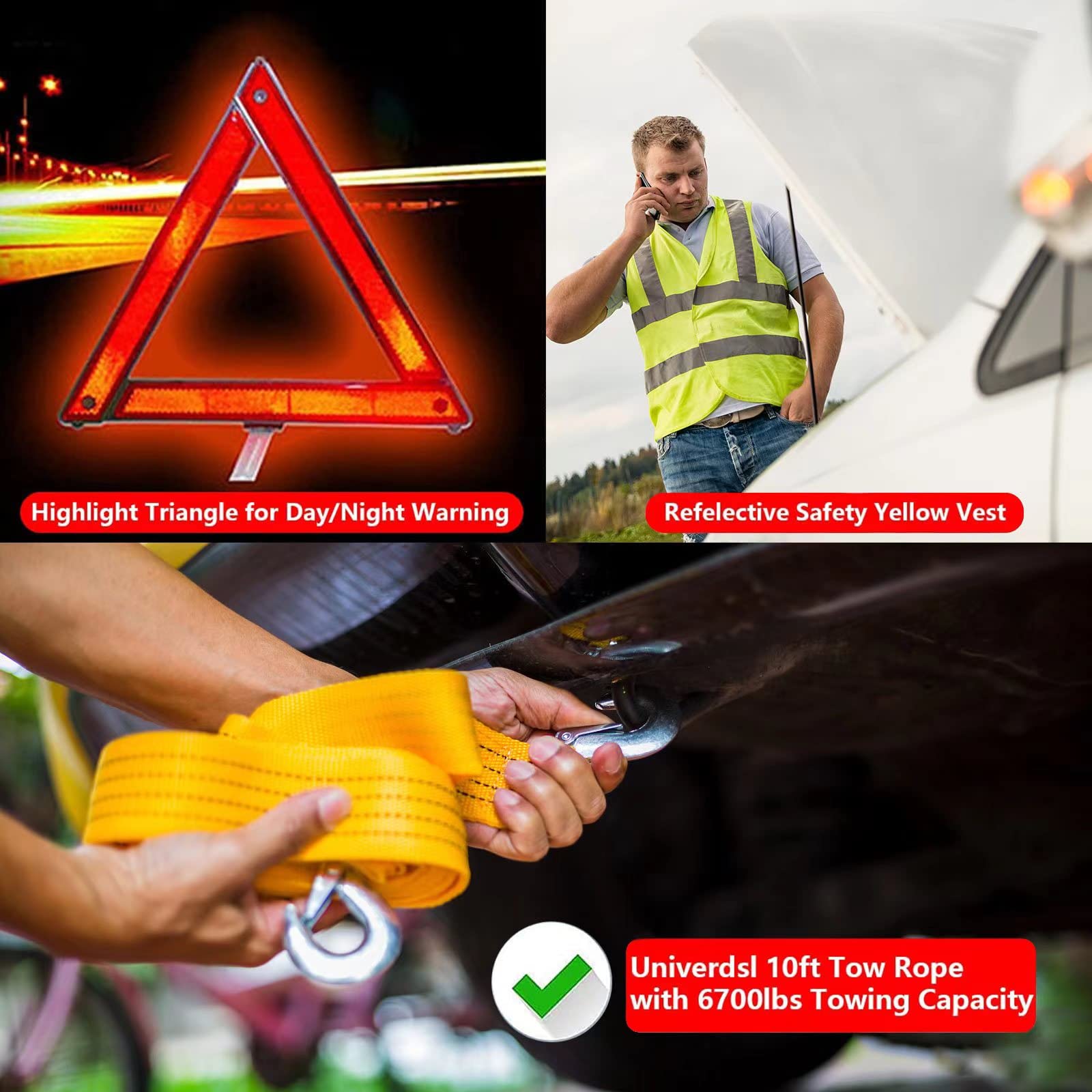 • KEEP PEACE OF MIND WHEN YOU NEED IT: Have you ever stopped car on the road and desperately waiting for help? This ideal car emergency kit for every driver on the road, just stash this automobile emergency kit in your vehicle, enable you can get your vehicle back to the roadside safely, solve variety of roadside emergencies issues