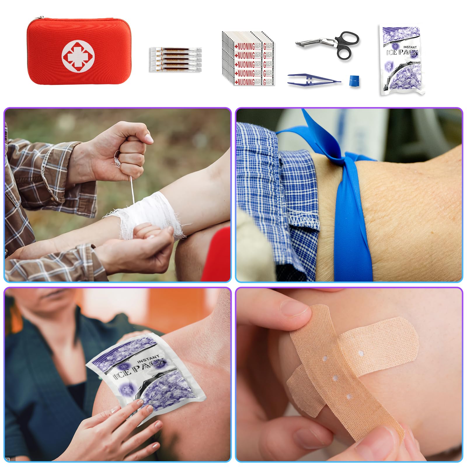 • [Accident Ready] This survival kit contains items including: instant ice pack, burn dressing, cotton swabs, emergency blanket, scissors, safety pins, bandages, gauze pads, etc, that can make all the difference, and it is a great emergency kit for basic supplies.