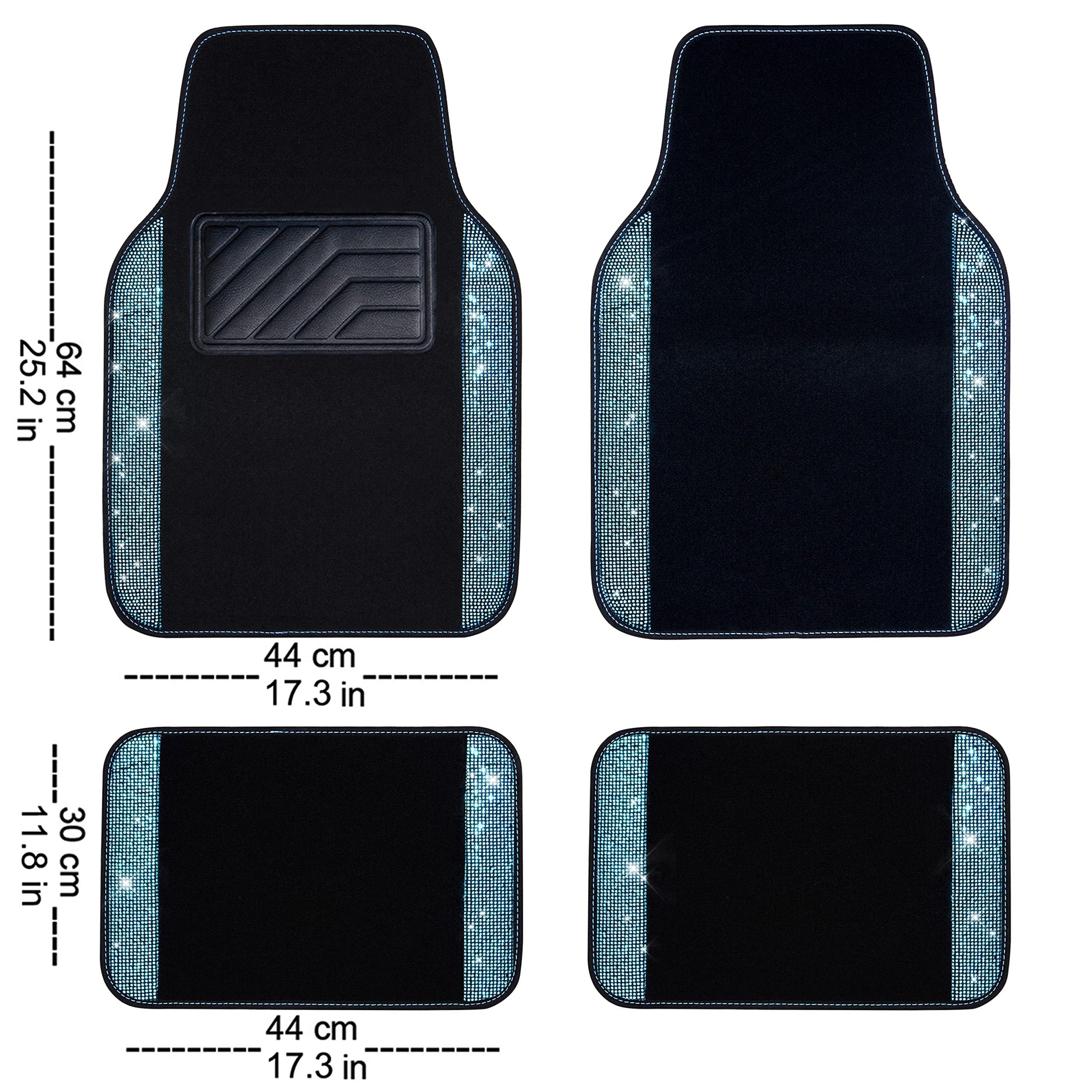 • SIZE AND COLOR - Universal size fits most vehicles: car, sedan, SUVs, truck, vans. Front Mat: 17.3' W x 25.2' L, Rear Mat 11.8' W x 17.3' L. Package Includes (4pcs) : Front Mat*2, Rear Side Mat*2. There are sparkling diamonds in different colors on the side of the mat, those diamonds make your car beautiful and shiny. Perfect cute gift for women and girls.