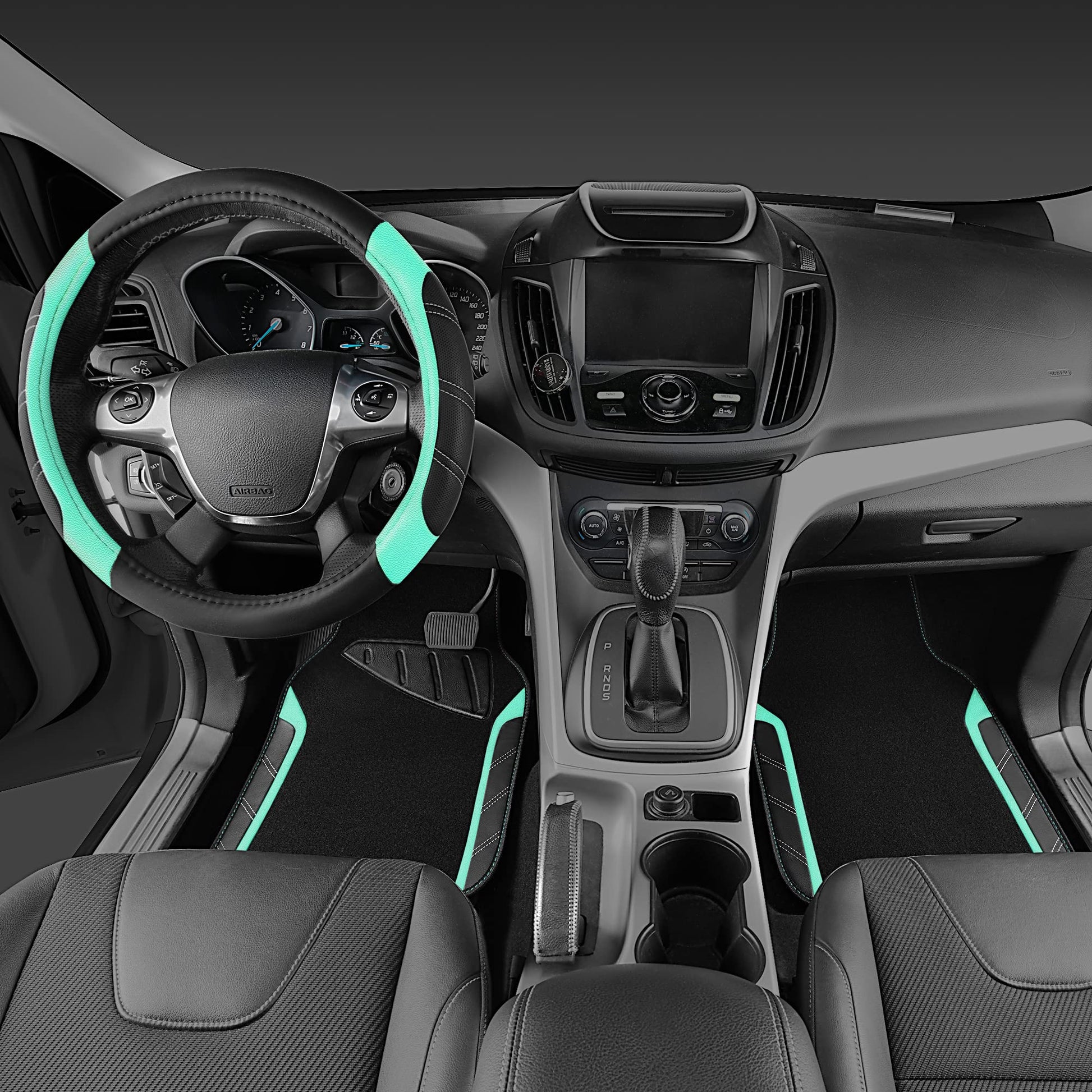 CAR PASS Leather Steering Wheel Cover and Waterproof Car Floor Mats,Microfiber Universal Car Combo Fit for 95% Sedan,SUV,Cars,14.5-15inch Sporty Anti-Slip Safety Comfortable Design(Black&Mint)