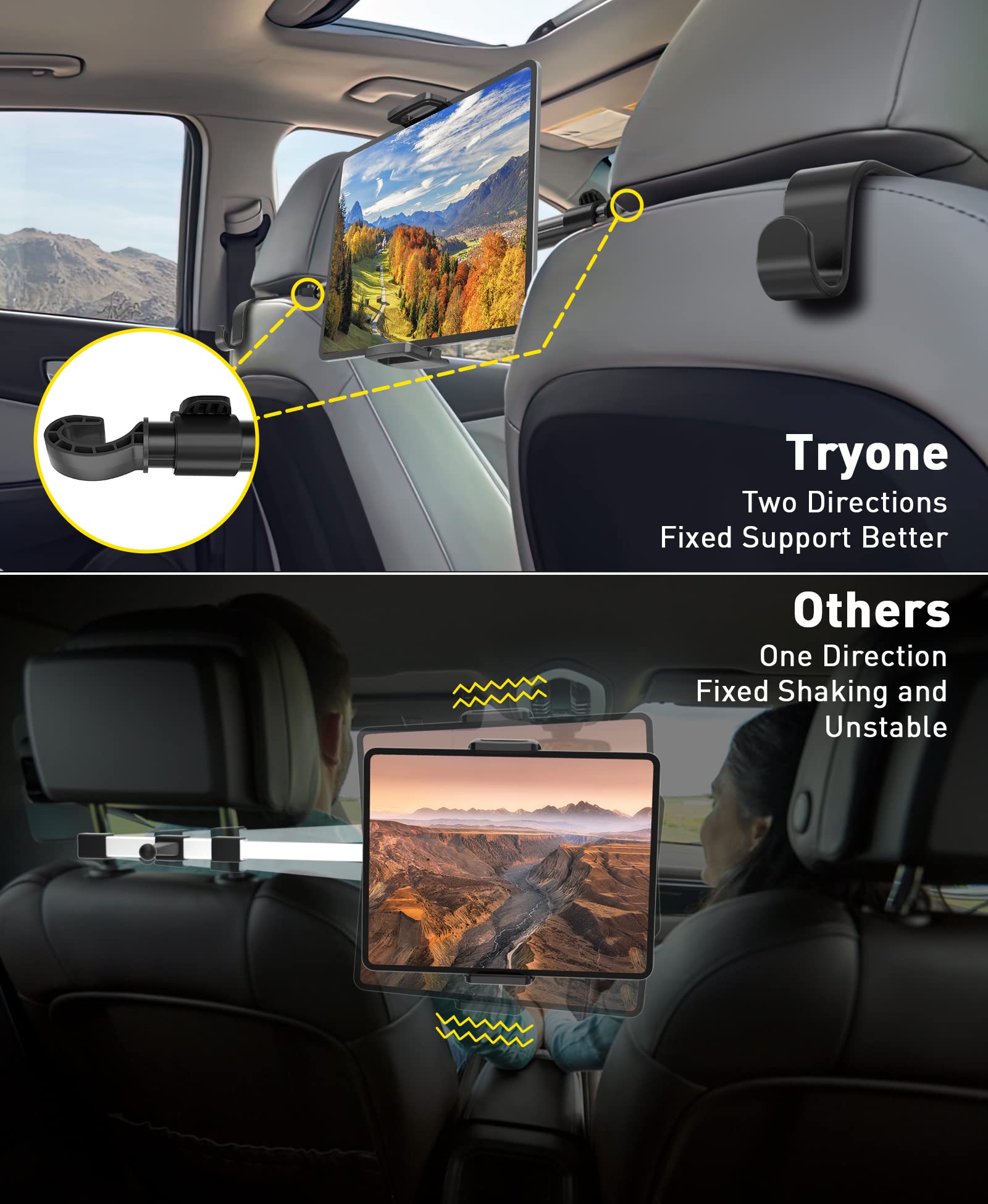 • 【Best Viewing Angle】 This Tryone Car Tablet Holder is specially designed for the rear seat, the tablet holder can be adjusted left and right, with 360° rotation and 75° tilt, whether it is one passenger, two passengers or three passengers, this headrest mount will provide the best viewing position