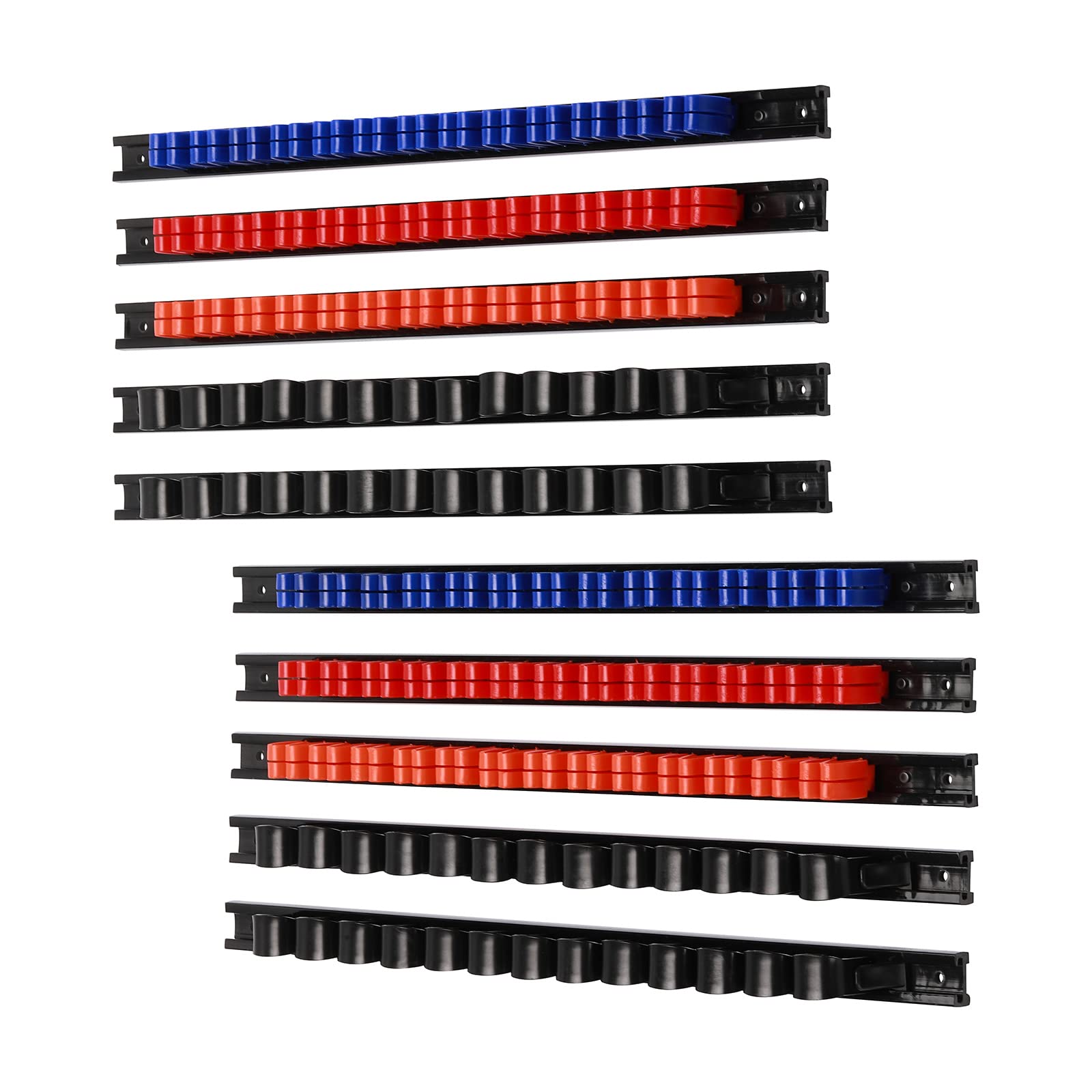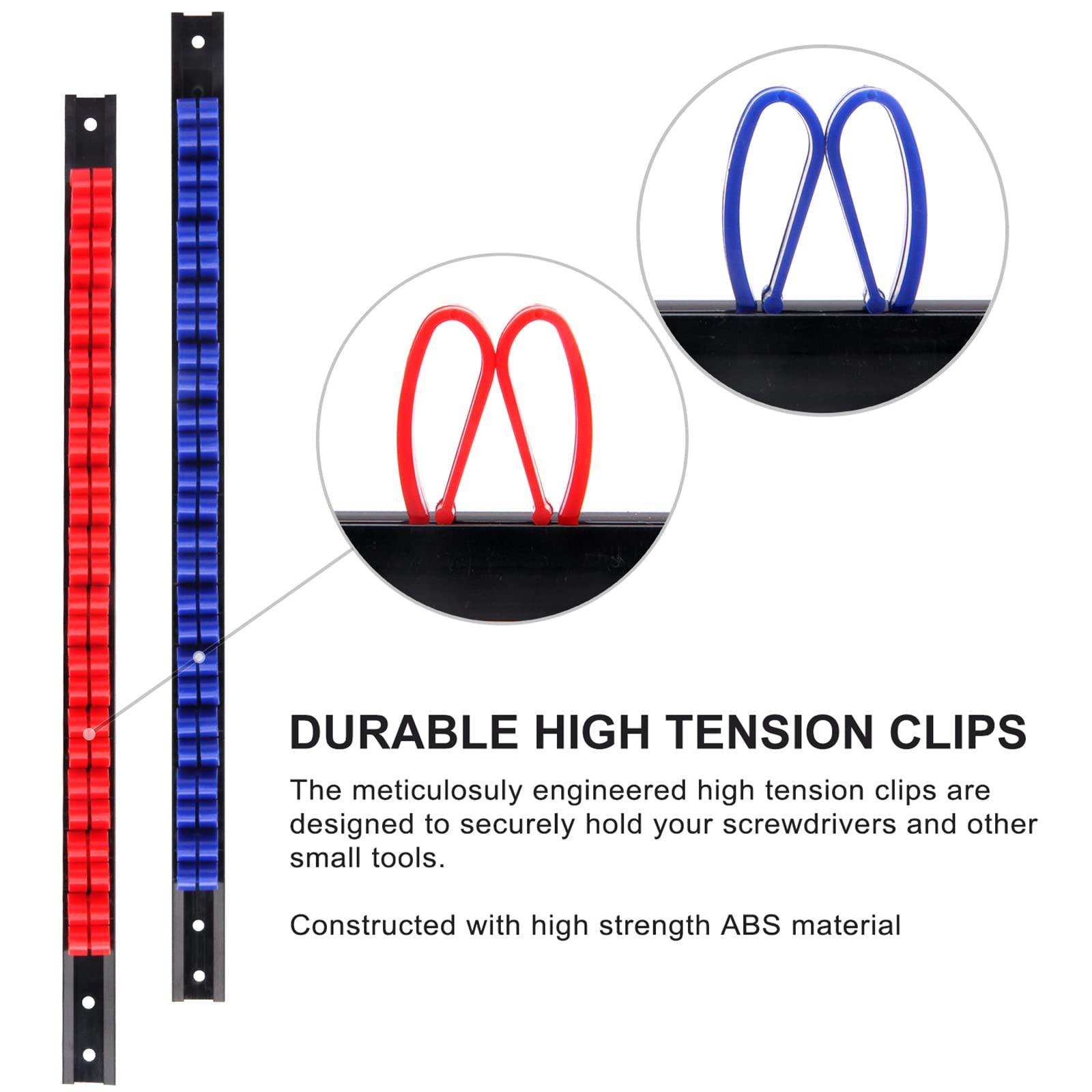 • Set includes 6 pcs screwdriver rails with 13pcs red clips, 13pcs organe clips, 13pcs blue clips and 4 pcs wrench rails with 52pcs black clips
