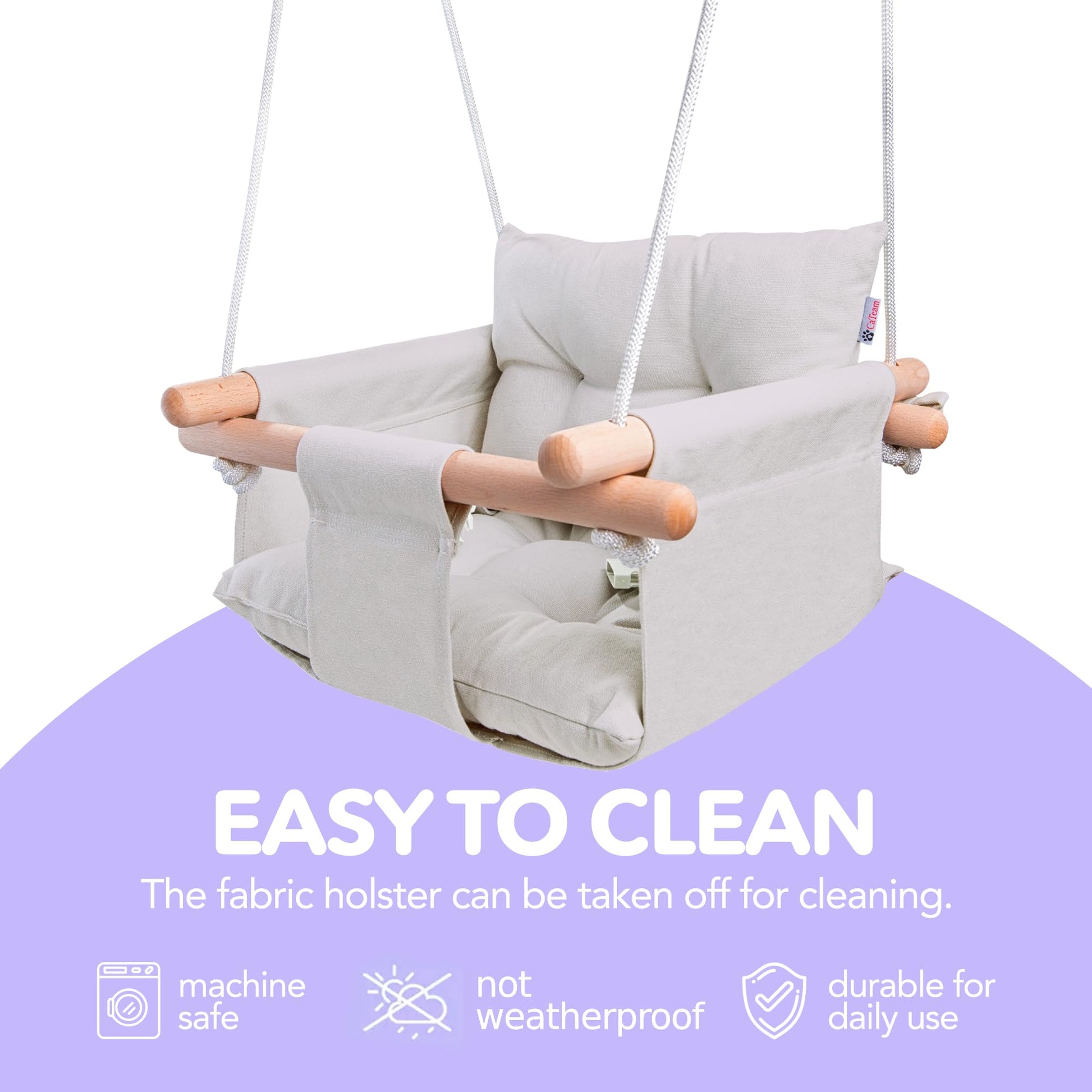 • Сanvas baby swing designed for children from 1 years Secure and Safe Design - Never compromise your little one's safety with this indoor/outdoor baby swing! Suitable for ages 1 - 4 years old, it features a 5-point harness belt attached to the toddlers swing seat to keep your kid securely fastened.to 4 years old. Swings toddlers are made with 100% upholstery fabric. Our pillows are stuffed with 100% polyester hypoallergenic stuffing. The wooden dowels are untreated and polished to perfection