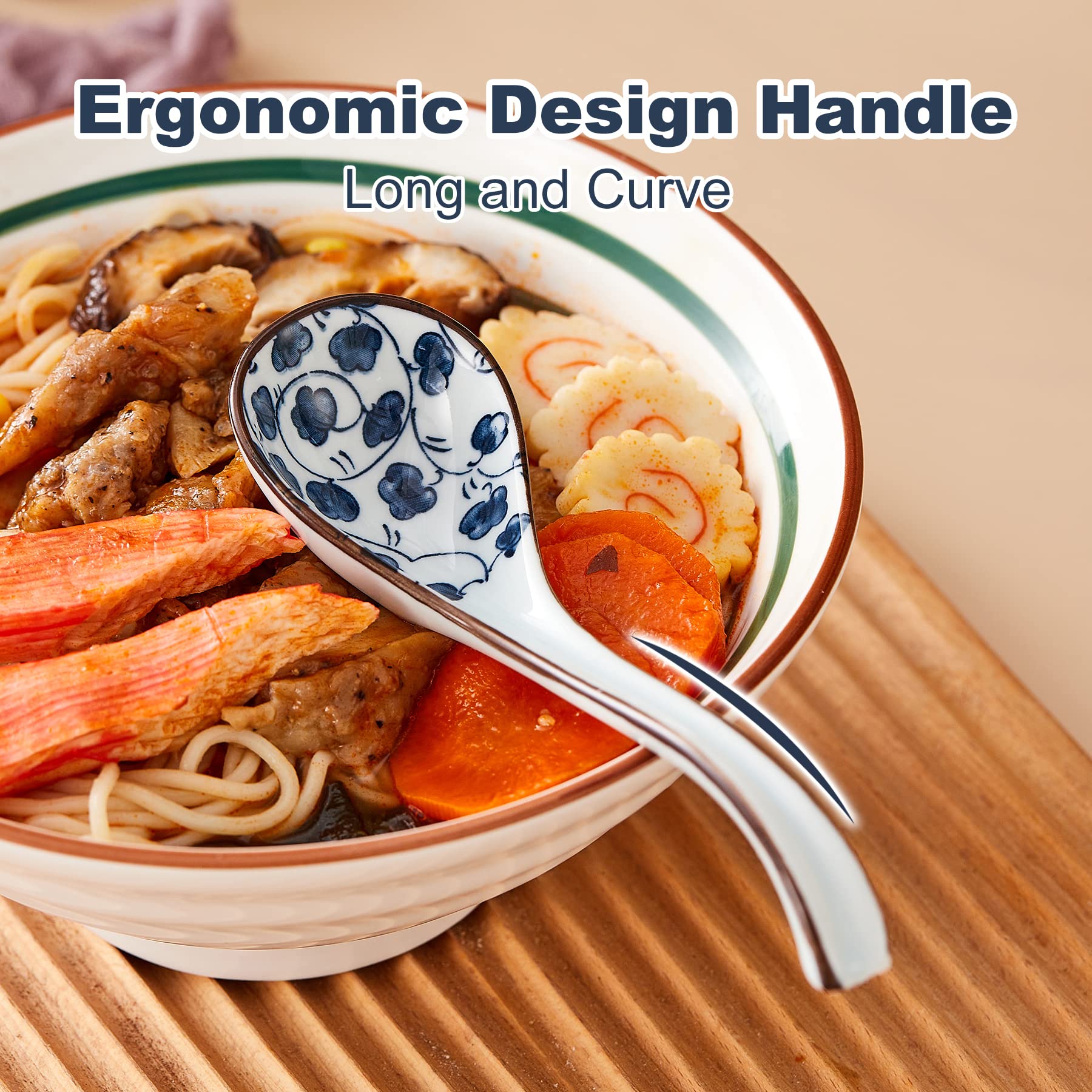 Ceramic Asian Soup Spoons, Easy to Hold, Long Handle Perfect Depth Spoon Set for Japanese Ramen Noodles, Chinese Dumpling, Pho, Miso, Wonton, Dishwasher Safe -Set of 4 - Blue