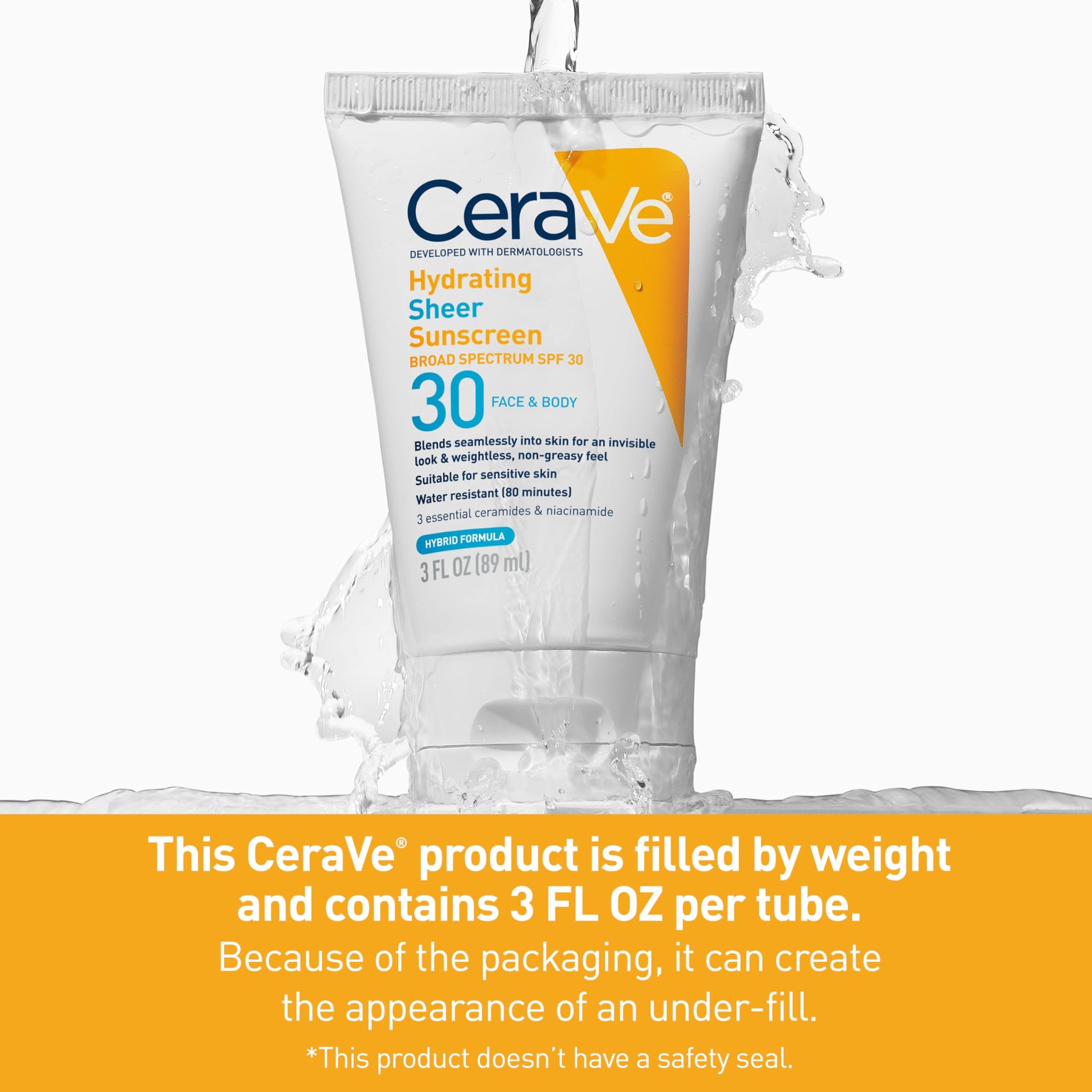 CeraVe Hydrating Sheer Sunscreen with SPF 30 for Face and Body, Mineral & Chemical Sunscreen for Men & Women with Zinc Oxide, Hyaluronic Acid and Ceramides, Paraben-Free + Fragrance-Free, 3 Ounces