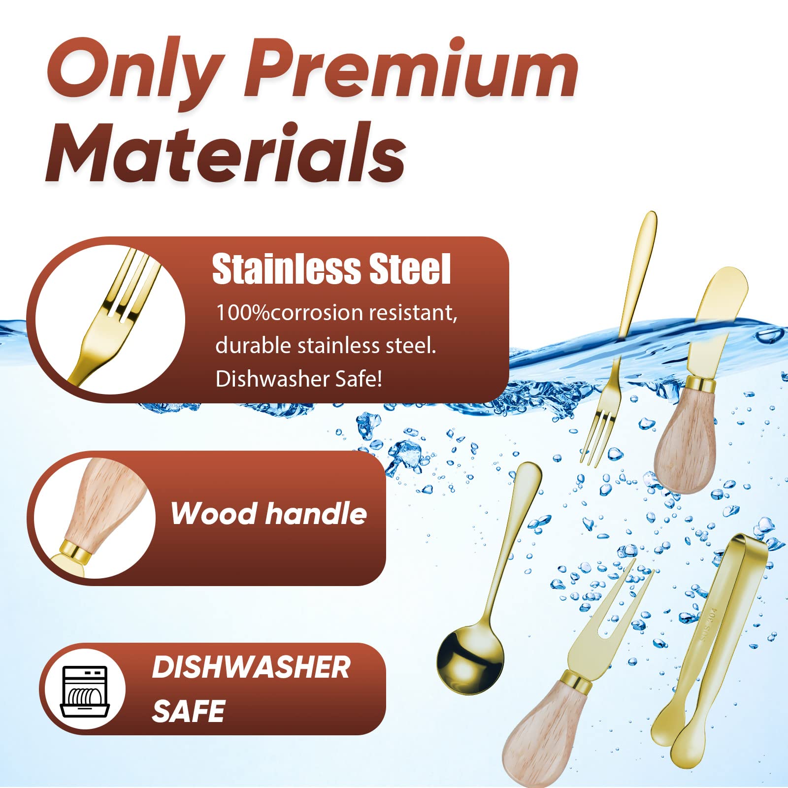 Quality material: the spreader knives set is made of stainless steel, all tools have a wooden handle except the spoons, serving tongs and forks, they are not easy to rust or break, not easy to bend, can be applied for a long time and many times