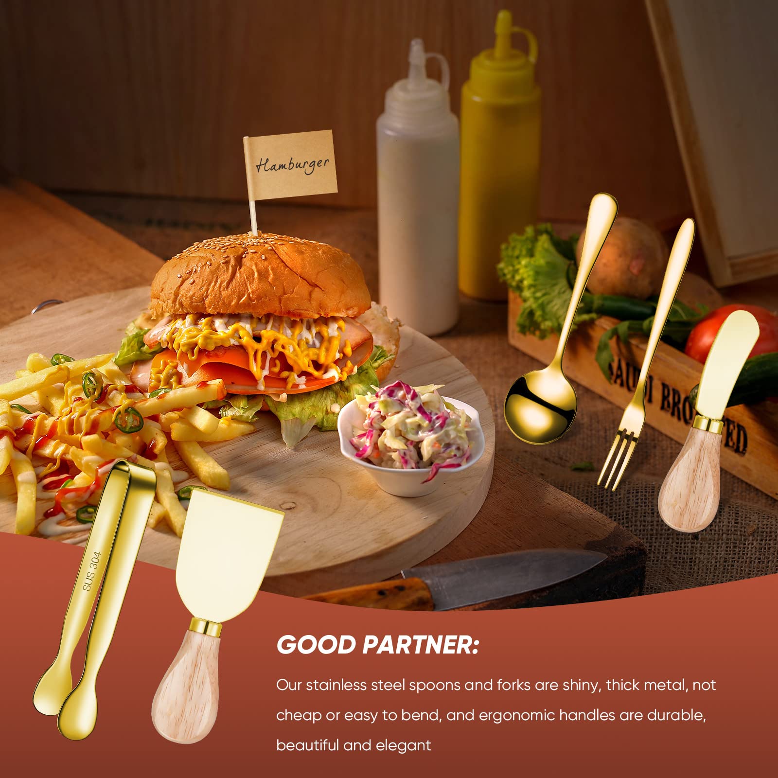 Charcuterie Board Accessories Spreader Knife Set Cheese Butter Spreader Knife Charcuterie Utensils with Wooden Handles Mini Serving Tongs Spoons Forks for party Wedding Christmas (Gold, 20 Pieces)