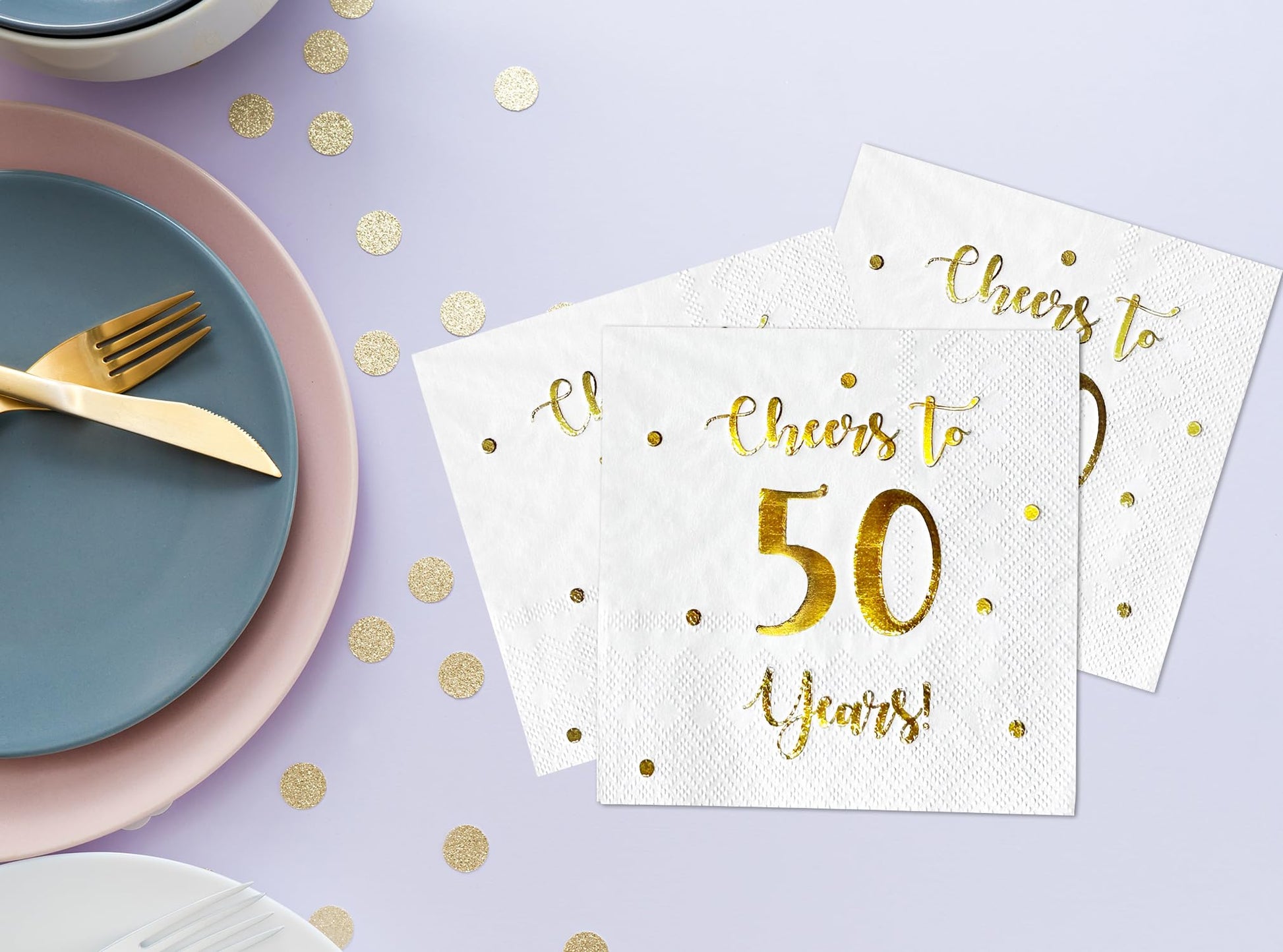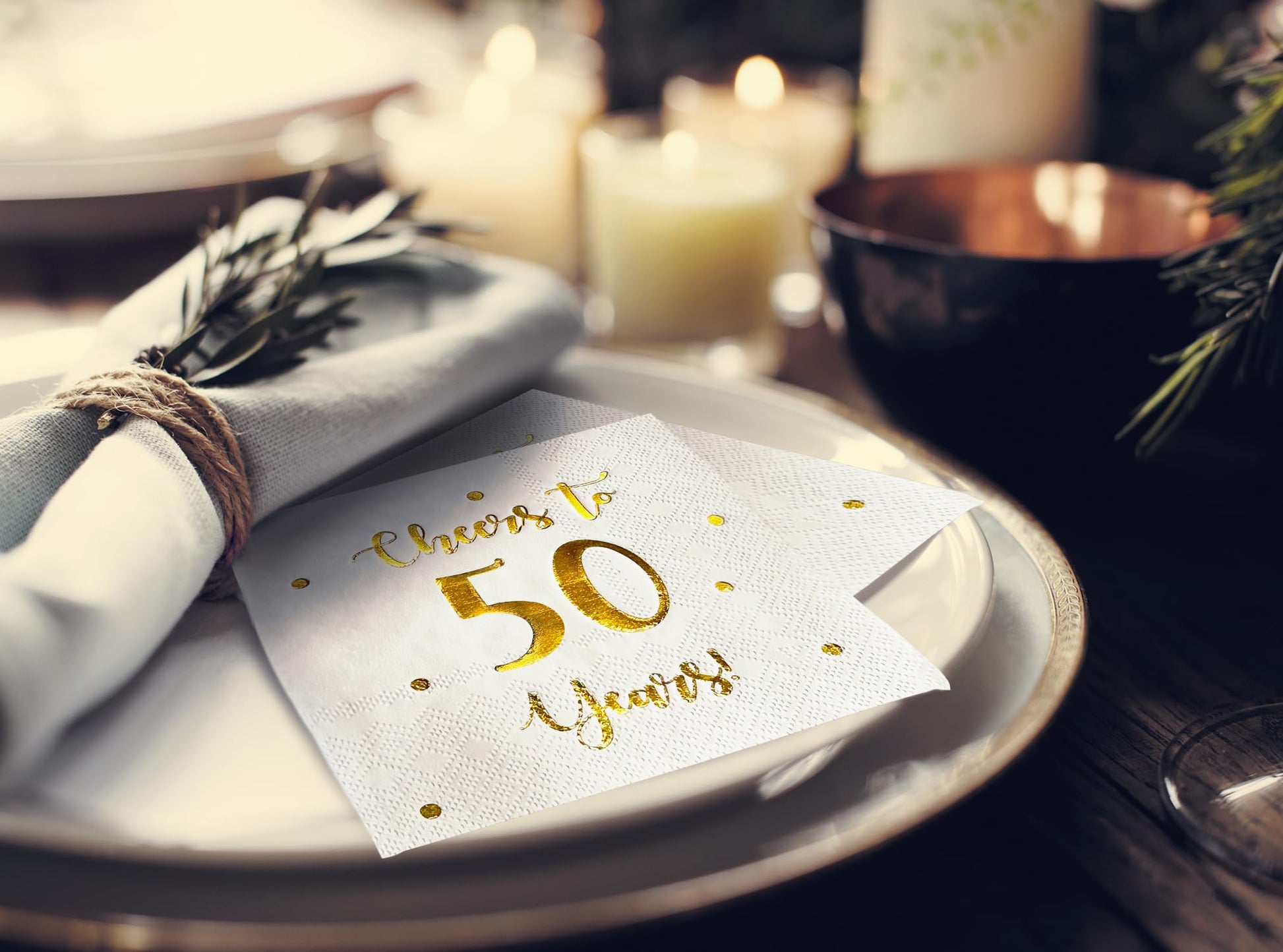 • SET INCLUDES: 50 premium quality white paper napkins with classic 'Cheers to 50 years' gold foil text and dots. 50 year celebrations happen once in a lifetime, celebrate them with good taste!