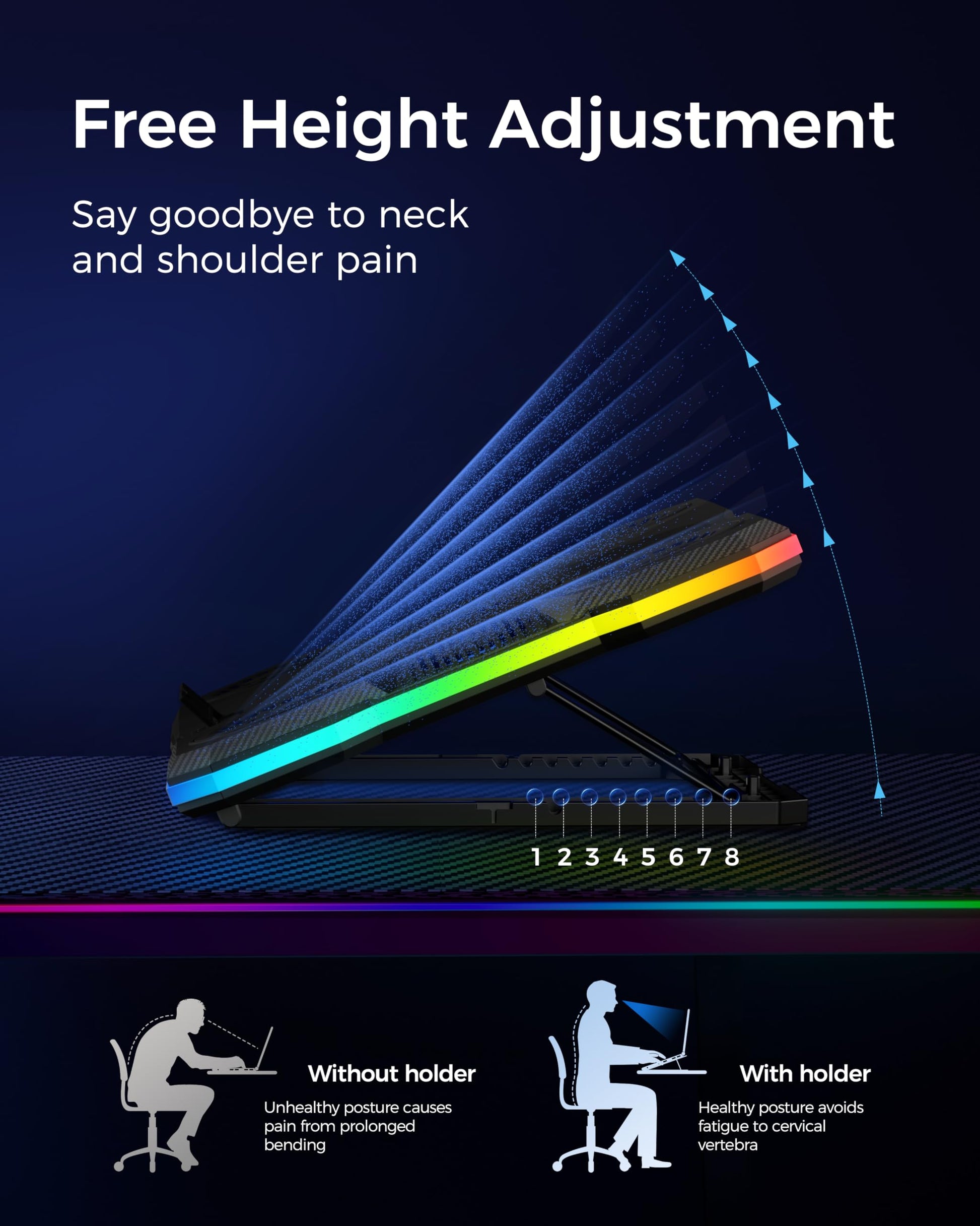 • Ergonomic comfort: The gaming laptop cooling pad provides 8 heights adjustment to choose.You can adjust the suitable angle by your needs to relieve the fatigue of the back and neck effectively.