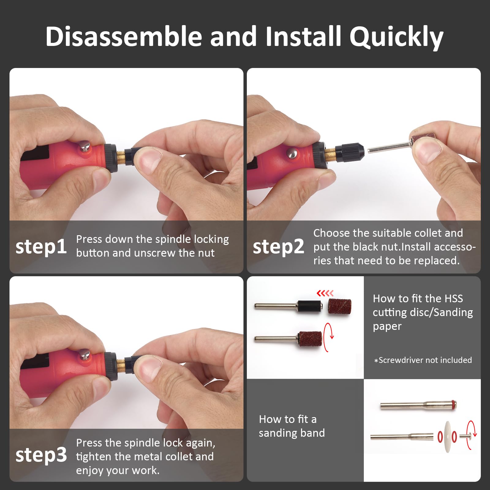 • 5 VARIABLE SPEEDS ADJUSTMENT - With 5 adjustable speeds (3000/6000/9000/12000/15000 RPM), our mini rotary tool empowers you to effortlessly tackle any small DIY project. Even if you're a beginner, still can experience effortless control joy. The cloud-lightweight feeling reduces hand strain, allows you to work for hours without fatigue.