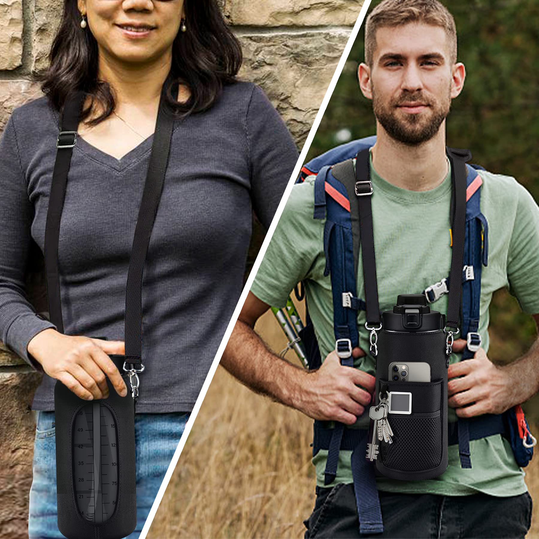 • INSULATED STORAGE SLEEVE DESIGNS: Multifunction Half Gallon Water Jug With Sleeve, which protects the water bottle from slip and fall. Unique Storage Sleeve Design that holds your cards and cell phone, keychain, and is finished with removable shoulder strap for convenient hands-free carrying!