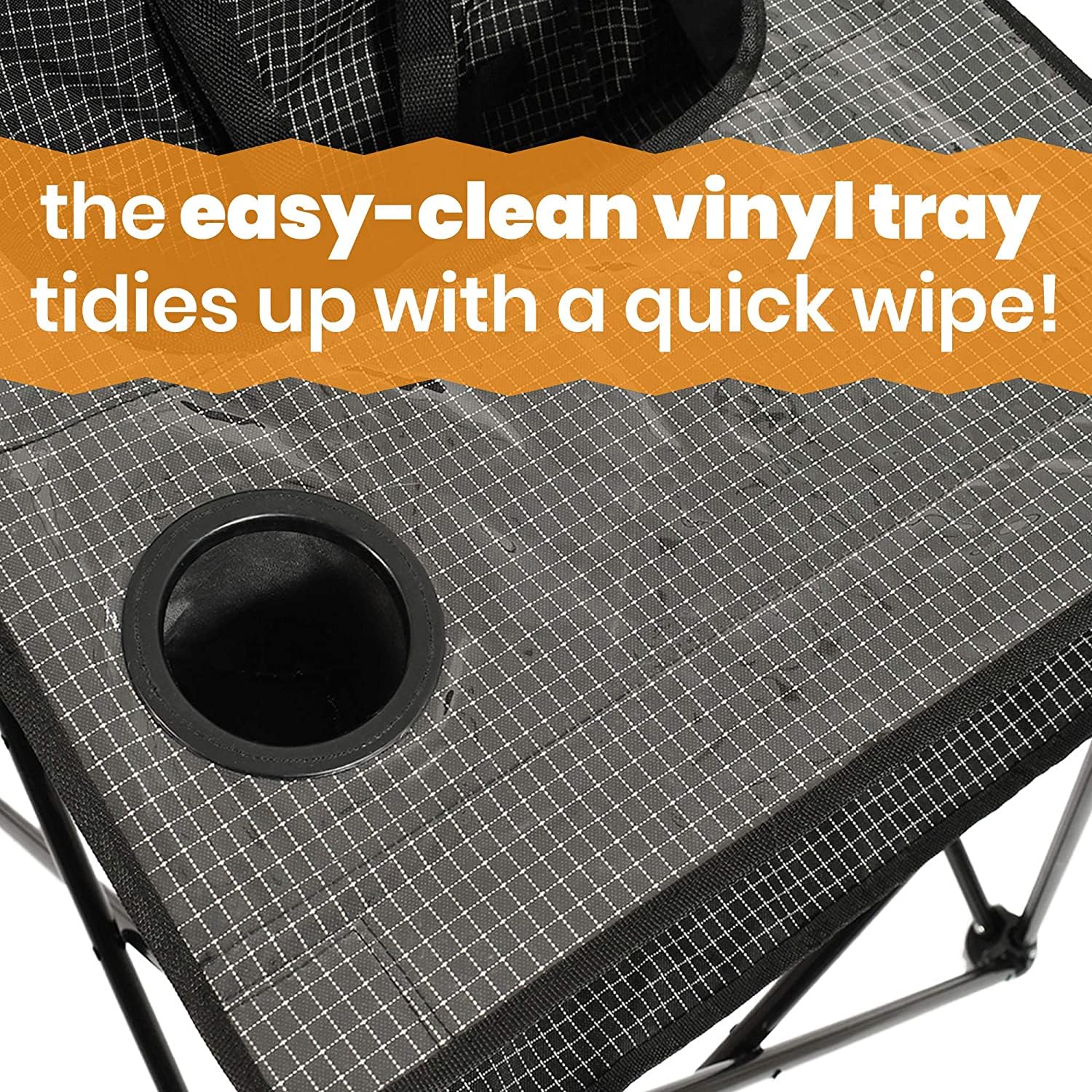 • EASY TO CLEAN FEEDING TRAY - Portable and compact enough for travel, beach days, picnics, camping, vacations, tailgating, and more. This collapsible highchair includes a built-in feeding tray and cup holder. The chair is made of durable nylon fabric and the tray is covered in clear vinyl that easily wipes clean with water.