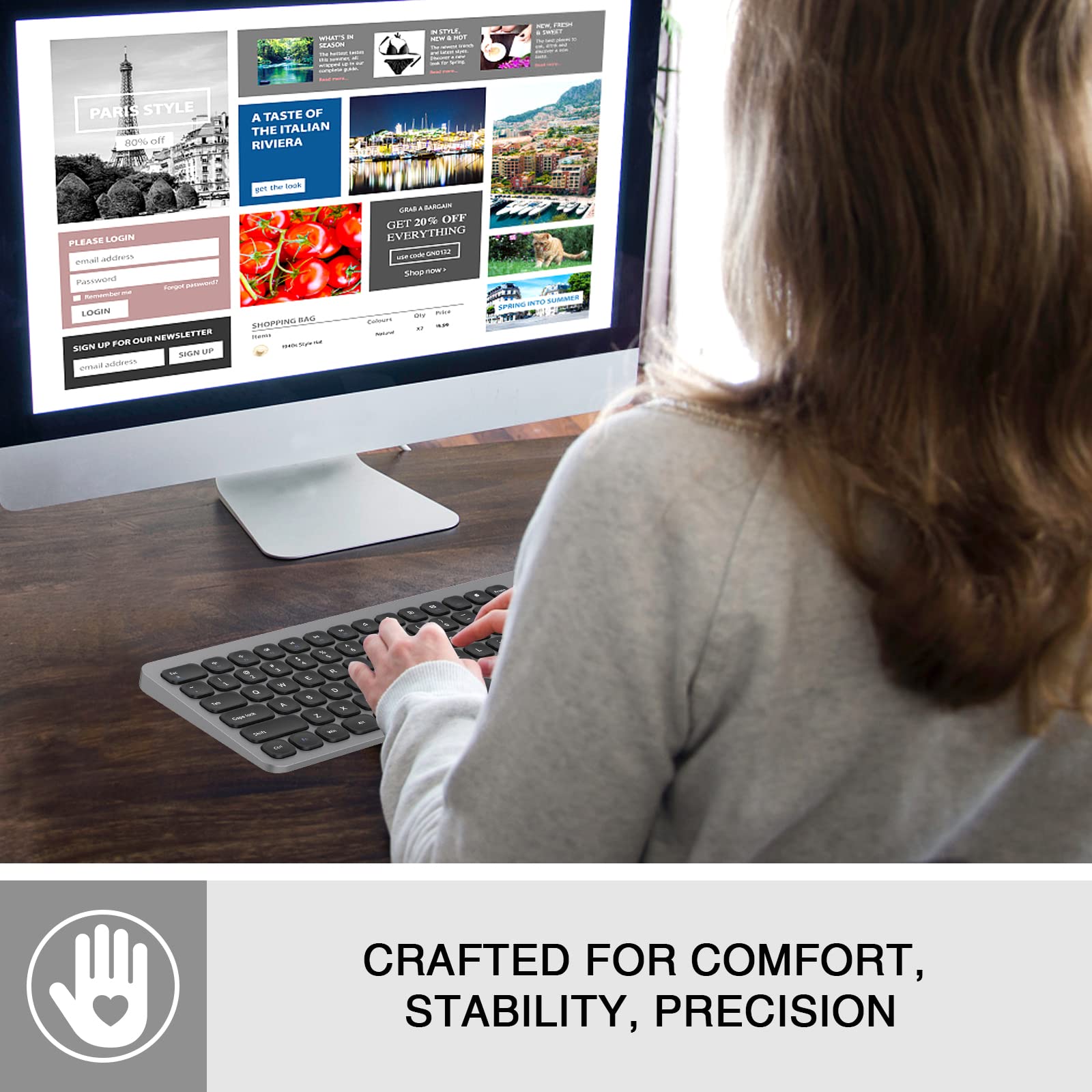 • Perfecto con un ordenador o portátil: nuestro teclado de ordenador de tamaño completo tiene 110 teclas, 17 teclas de acceso rápido y un teclado digital que coincide perfectamente con su ordenador y se ve de moda en su escritorio, haciéndole más eficiente.