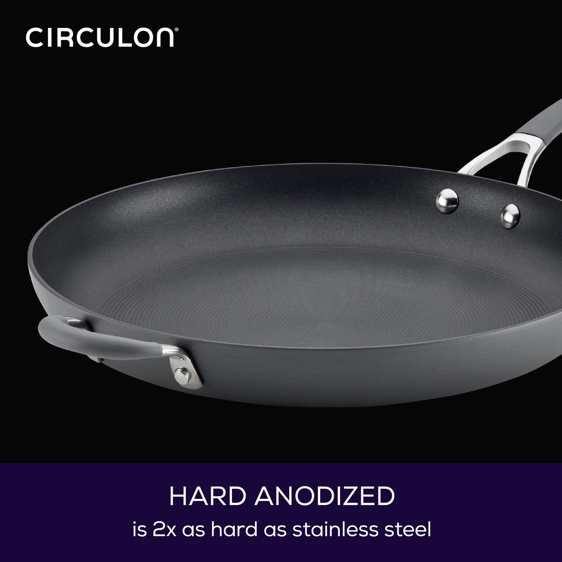 Details: Energize the kitchen for performance and dishwasher safe convenience using the versatile Circulon Radiance Hard-Anodized 14-Inch Nonstick Frying Pan with Helper Handle. Circulon Radiance is engineered with superior nonstick technology and dishwasher-safe convenience. The heavy-duty hard-anodized cookware construction of this 14-inch fry pan provides even heat distribution for every cooking technique. A sturdy handle and convenient helper handle provide comfortable, confident grips, and are dual-riveted for added support. This high-quality frying pan boasts the TOTAL Nonstick System of raised circles and premium nonstick for easy food release and cleanup. Best of all, Circulon Radiance cookware is dishwasher safe and oven safe to 400°F while being compatible with all stovetops except induction. Circulon Radiance cookware includes a Limited Lifetime Warranty. Elevate to the next level of kitchen convenience with the dishwasher-safe Circulon Radiance Hard-Anodized 14-Inch Nonstick Frying Pan with Helper Handle.