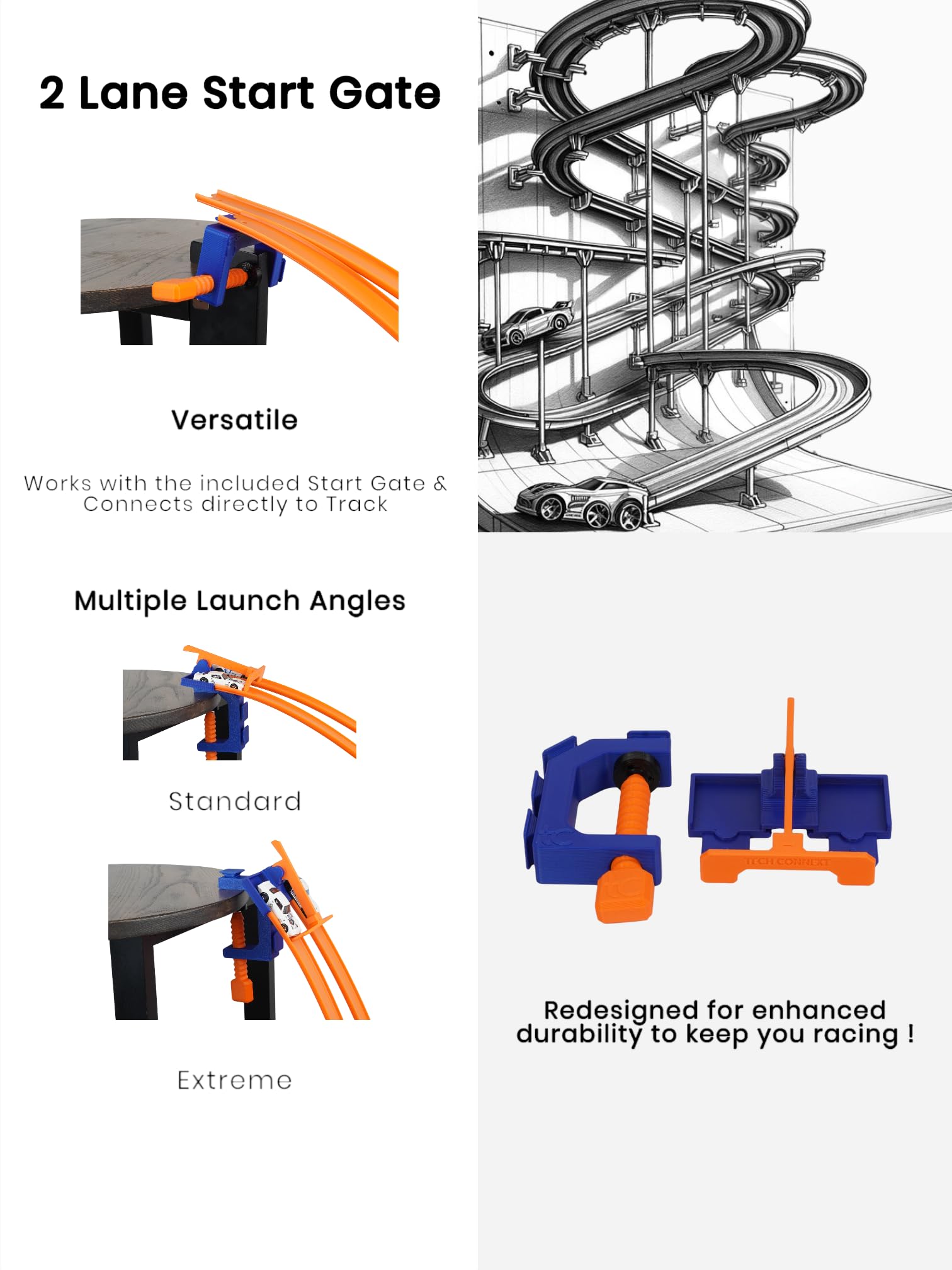 Clamp with 2 Lane Starter Gate Compatible with Hot Wheels Cars and Track (Blue/Orange)