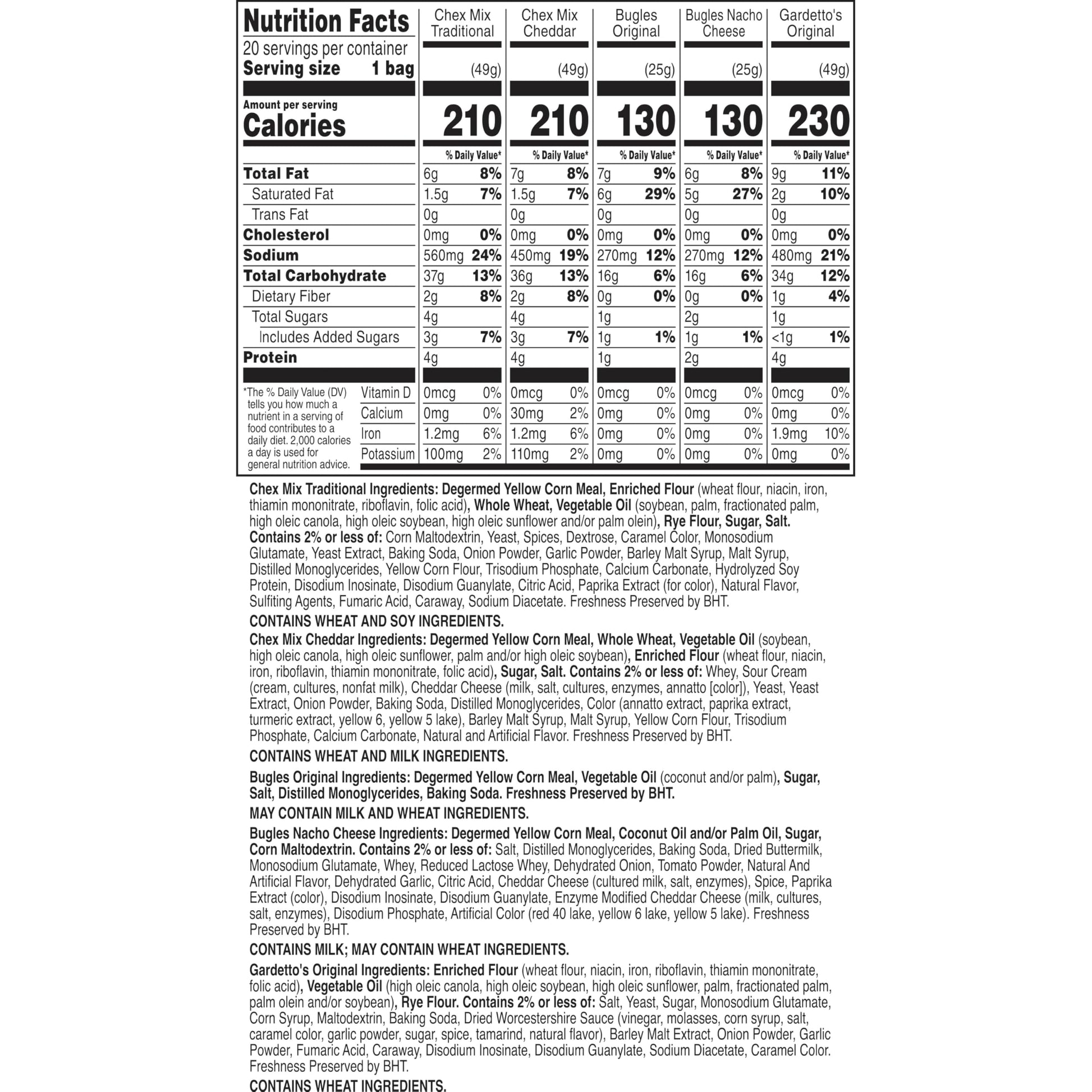 • CONTAINS: One 28 oz variety pack box of Classic Mix snacks with 20 single serve bags; 4 bags each of Bugles Original, Bugles Nacho Cheese, Gardetto's Original Recipe, Chex Mix Traditional Original Recipe, and Chex Mix Cheddar