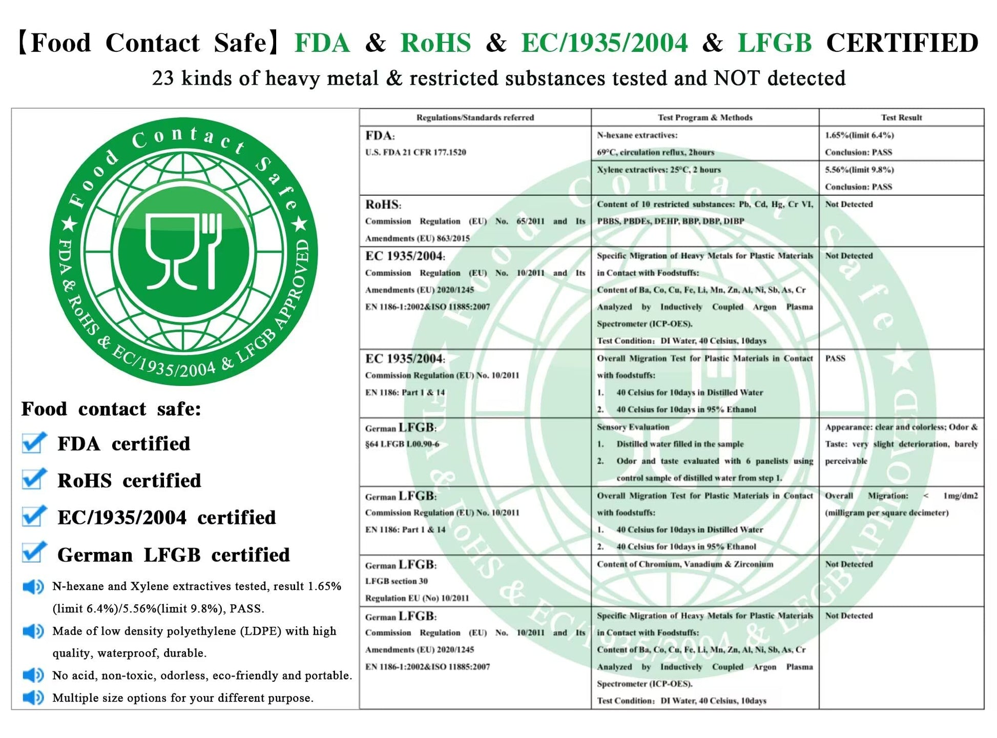 • Food contact safe: FDA & RoHS & EC/1935/2004 & German LFGB certified, made of low density polyethylene material (LDPE), please feel free to use. 23 kinds of heavy metal/restricted substances tested and NOT detected. N-hexane and Xylene extractives tested, result 1.65%(limit 6.4%)/5.56%(limit 9.8%).