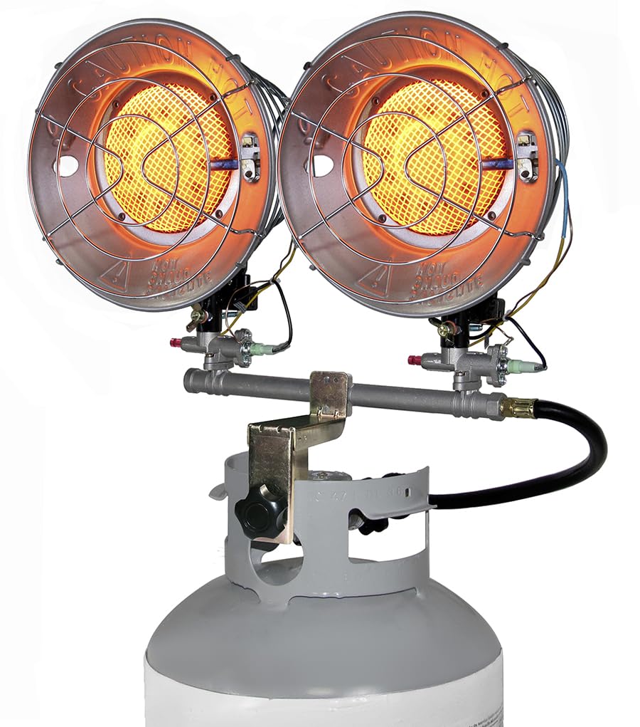 Details: TT-30CSA, Dura Heat dual tank top heaters with match light ignition and double burner adds twice the heat for those tricky outdoor spaces, patios, tailgating, ice-fishing, and hunting. The versatile tank top heater is a good low cost solution for extra heat in many outdoor situations. Quiet infrared heat, no electricity, and tough construction. Propane tank not included