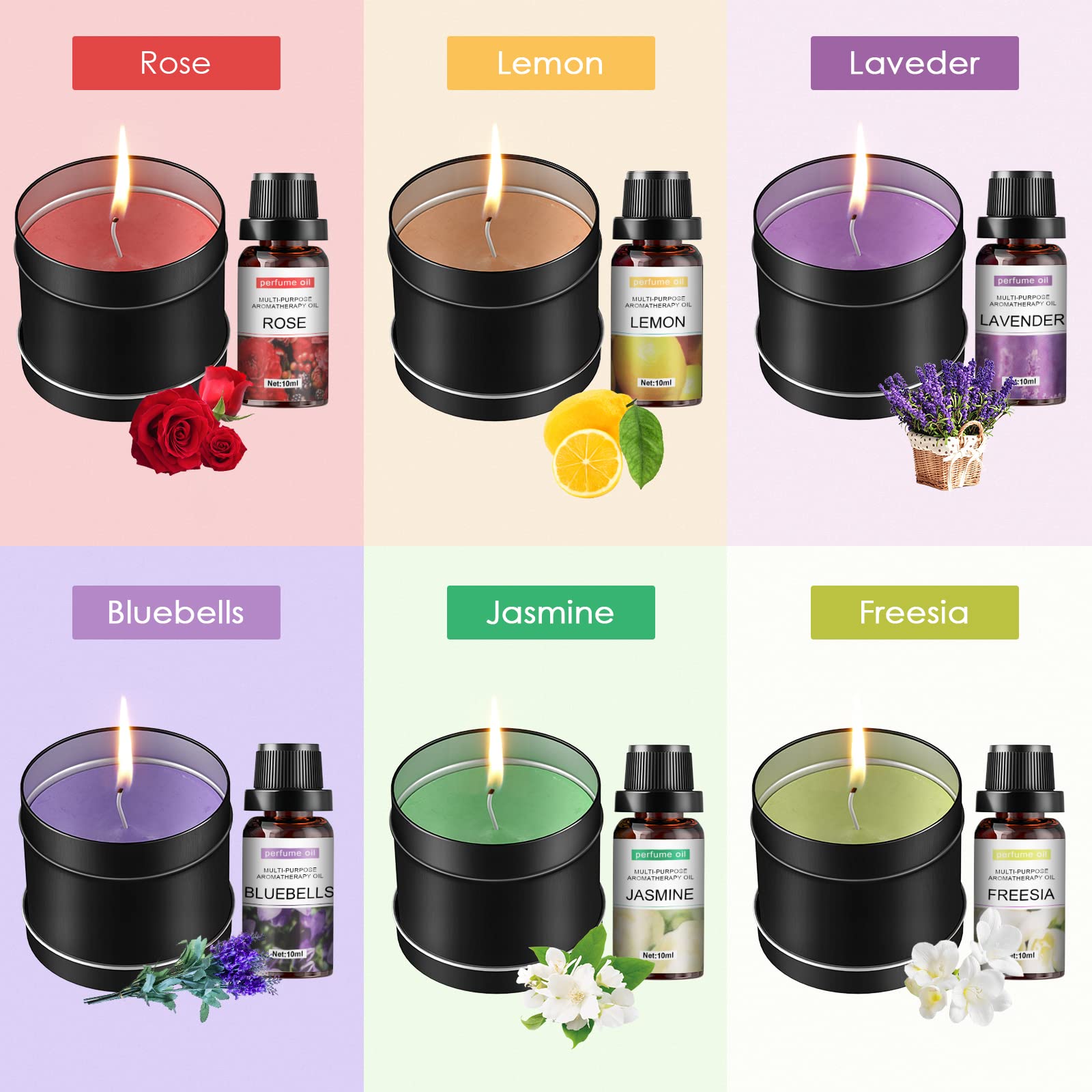 • 🎁Premium Candle Making Kit:Our candle making supplies is suitable for all levels and contains everything needed to make scented homemade candles: 6 candle essential scents(Lavender essential oil+Rose essential oil+Lemon essential oil+Jasmine essential oil+Freesia essential oil+Bluebells essential oil), 20 candle dyes, 5 bags of Beeswax, 1 thermometer,1 candle melting pot, 1 candle wax melter, 1 stirring spoon,10 wick center devices,10 black candle tins,20 candle wicks,10 stickers