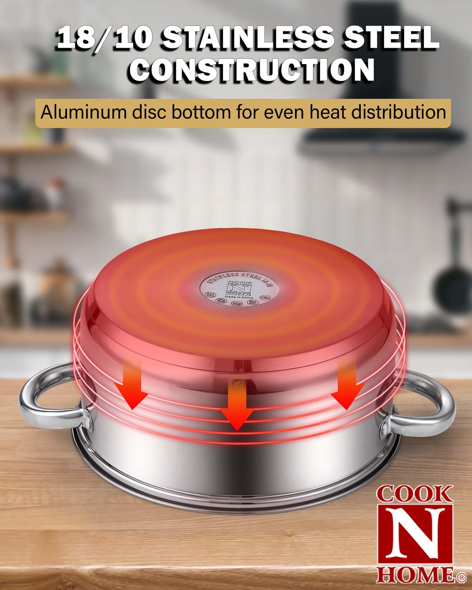 • Excellent Heat Distribution: The stainless steel pots and pans set is made of mirror-polished 18/10 stainless steel with an aluminum disc bottom for even and quick heat distribution, preventing hot spots