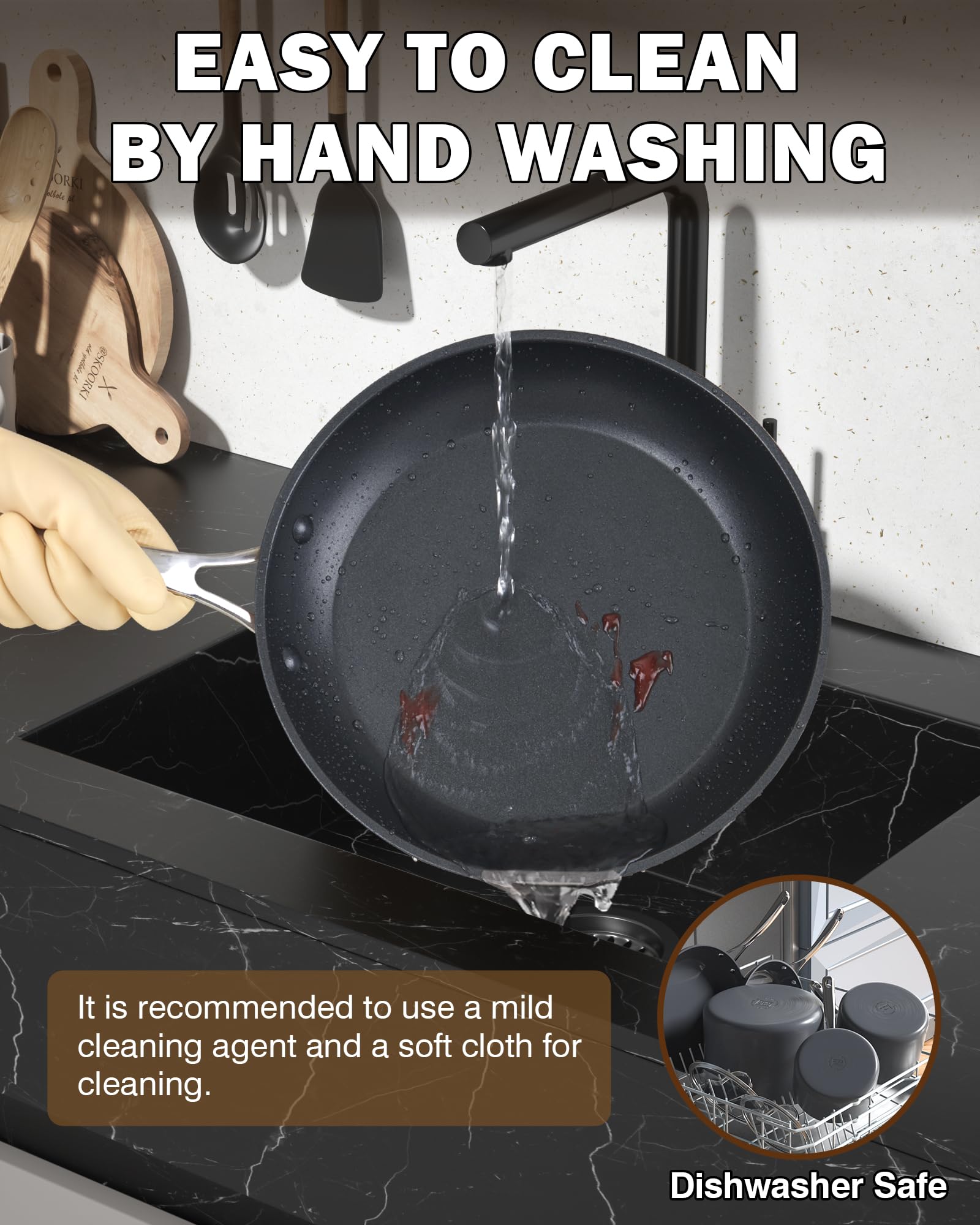• Hard Anodized Nonstick: The Hard Anodized non stick frying pan is more wear-resistant than an ordinary nonstick pan; Its surface is specially treated to form a hard non-stick coating, which effectively prevents food from sticking to the bottom