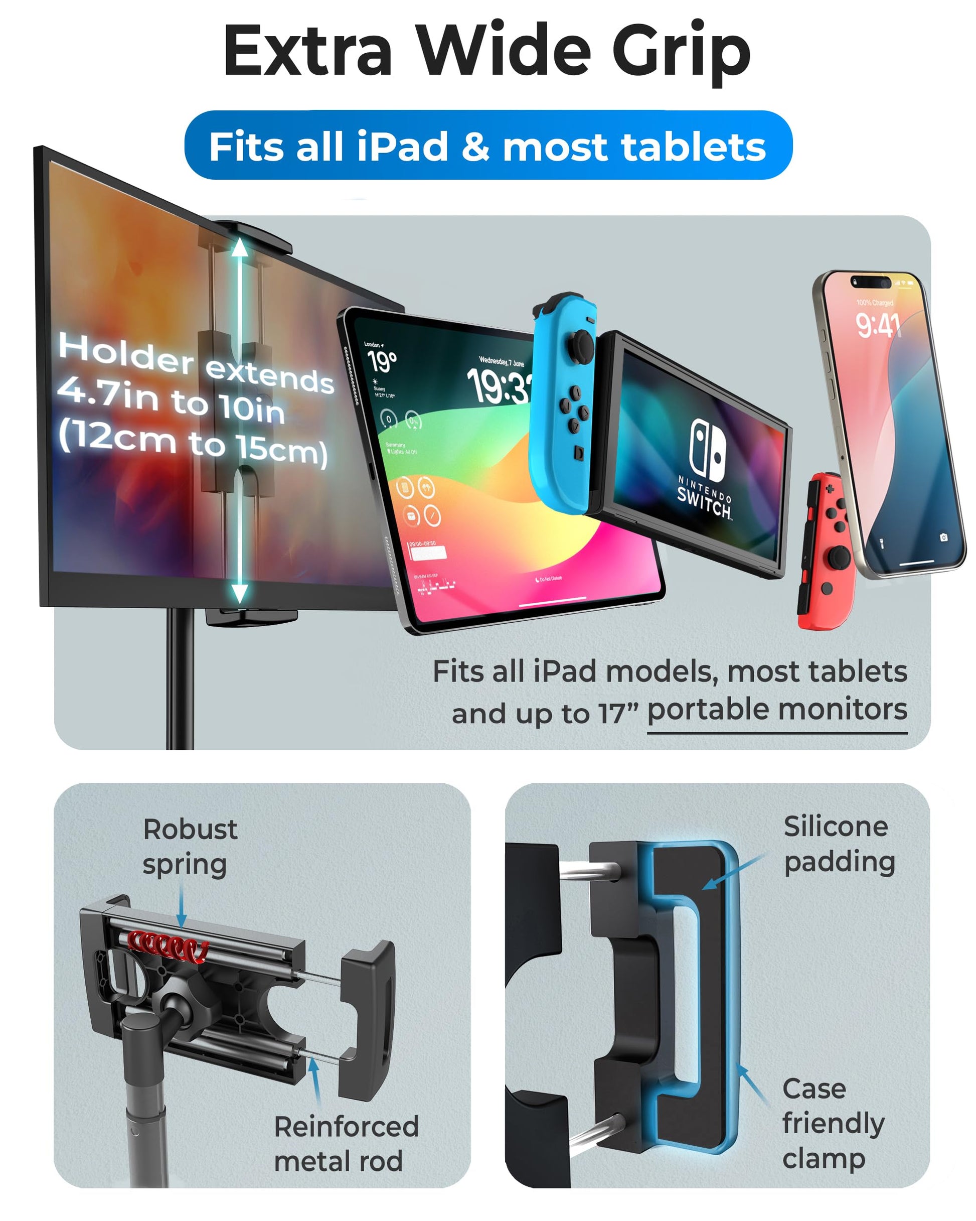 • Enhanced Stability System: Professional-grade tablet stand supporting up to 4.4lbs/2kg; reinforced with silicon insert technology for heavy 17' displays; maintains perfect position with 360° rotation even under maximum load; ideal portable monitor stand and iPad stand for desk