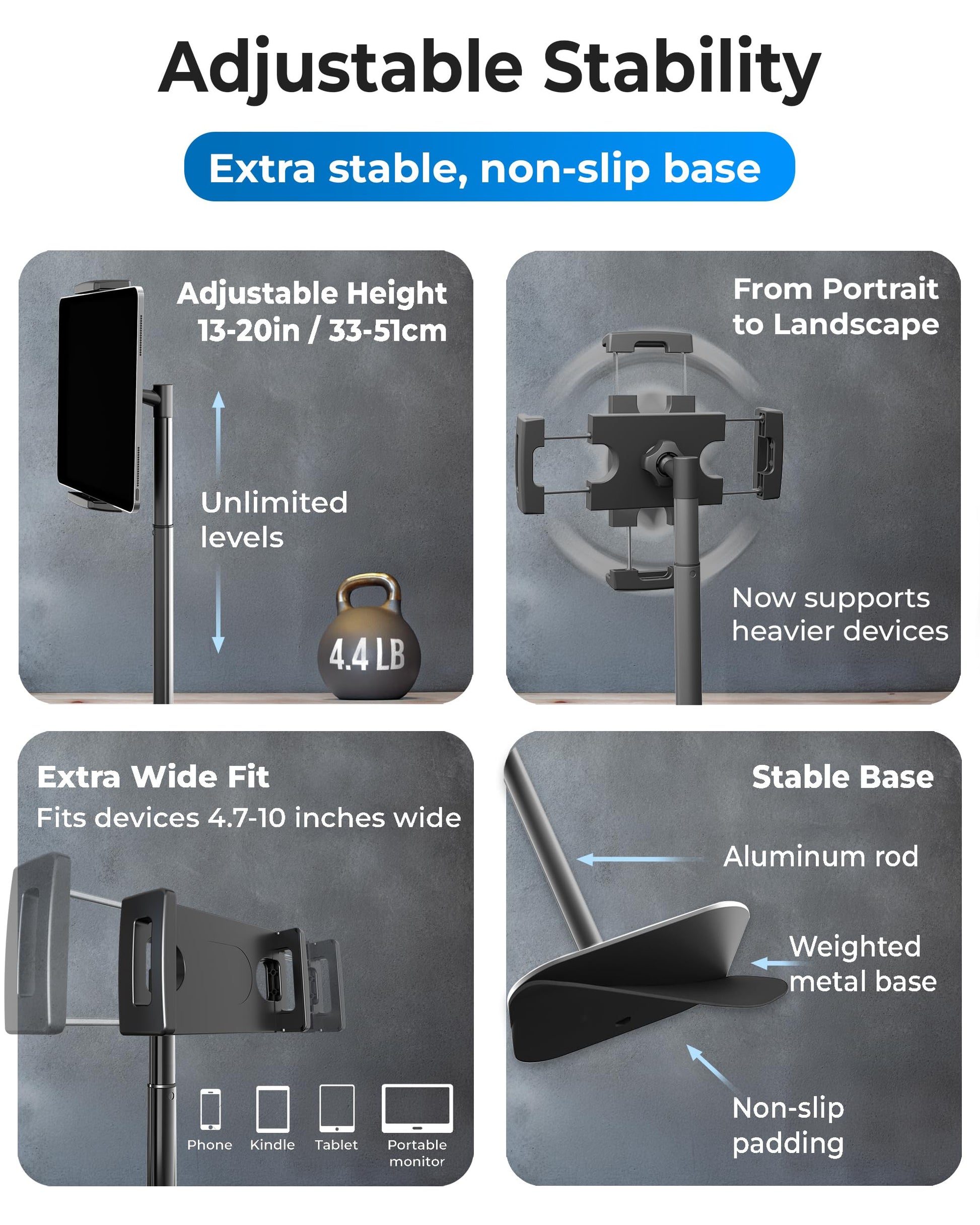 • Precision Engineering: Strengthened aluminum construction with height adjustment from 13-20'; secure grip for devices 4.7-10' wide; prevents drooping with heavier devices