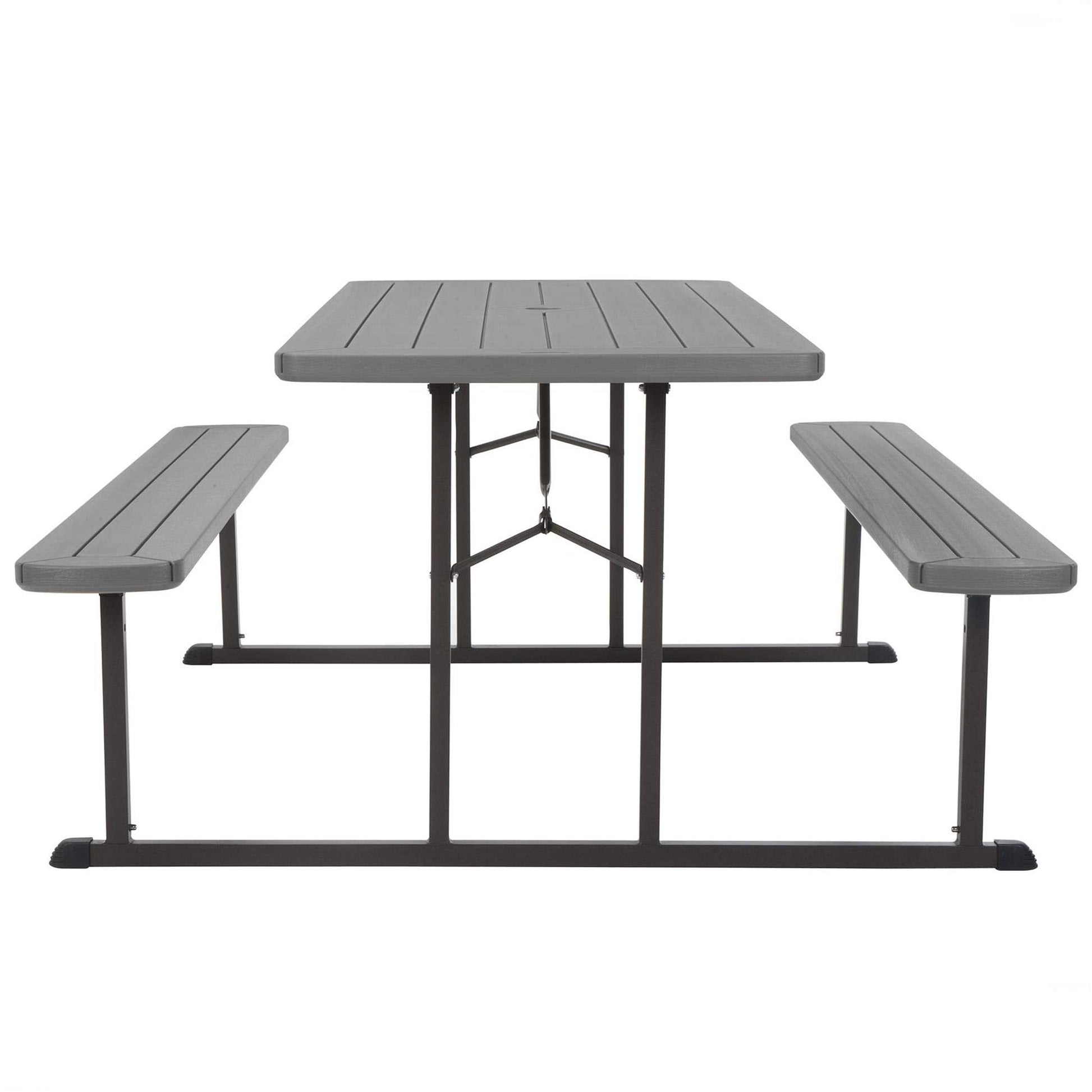 Details: The COSCO 6 Foot Wood Grain Blow Mold Folding Picnic Table is a great addition to any backyard. Picnic table comfortably sits 8 people. Each bench has a weight capacity of 800 lbs. Product is easy to clean, durable, maintenance free. Constructed with a stable steel frame, the table is designed with dark gray, wood grain resin table top and benches . At the end of the season, the picnic table easily folds to store during the winter months. While folded, can also be transported. The table also includes an umbrella opening (umbrella sold separately). Minimal assembly is required. The COSCO collection of durable and affordable outdoor furniture folds, stacks, and nests to fit your space – no matter the size. From your backyard to your balcony, outdoor furniture enhances your home with space saving and price conscious practicality. COSCO Outdoor Living™, a brand of COSCO Products®, offers space saving folding groups to roomy conversation and dining sets, designed to meet all your outdoor patio needs. Our collections help create your own outdoor lounging spaces or cozy living areas on your patio or deck. Our outdoor products are designed with form and function in mind to help you create the outdoor space you dream of. Design aspects for COSCO Outdoor Living™ products include innovation, style, and elegance to suit any customer’s home décor or design motif. Manufactured with durable, weather-resistant materials, our furniture is built to last and to impress. We offer different color options on multiple sets, making it easy to fit your personal taste. We invite you to sit back, relax and enjoy your COSCO Outdoor Living™ furniture.