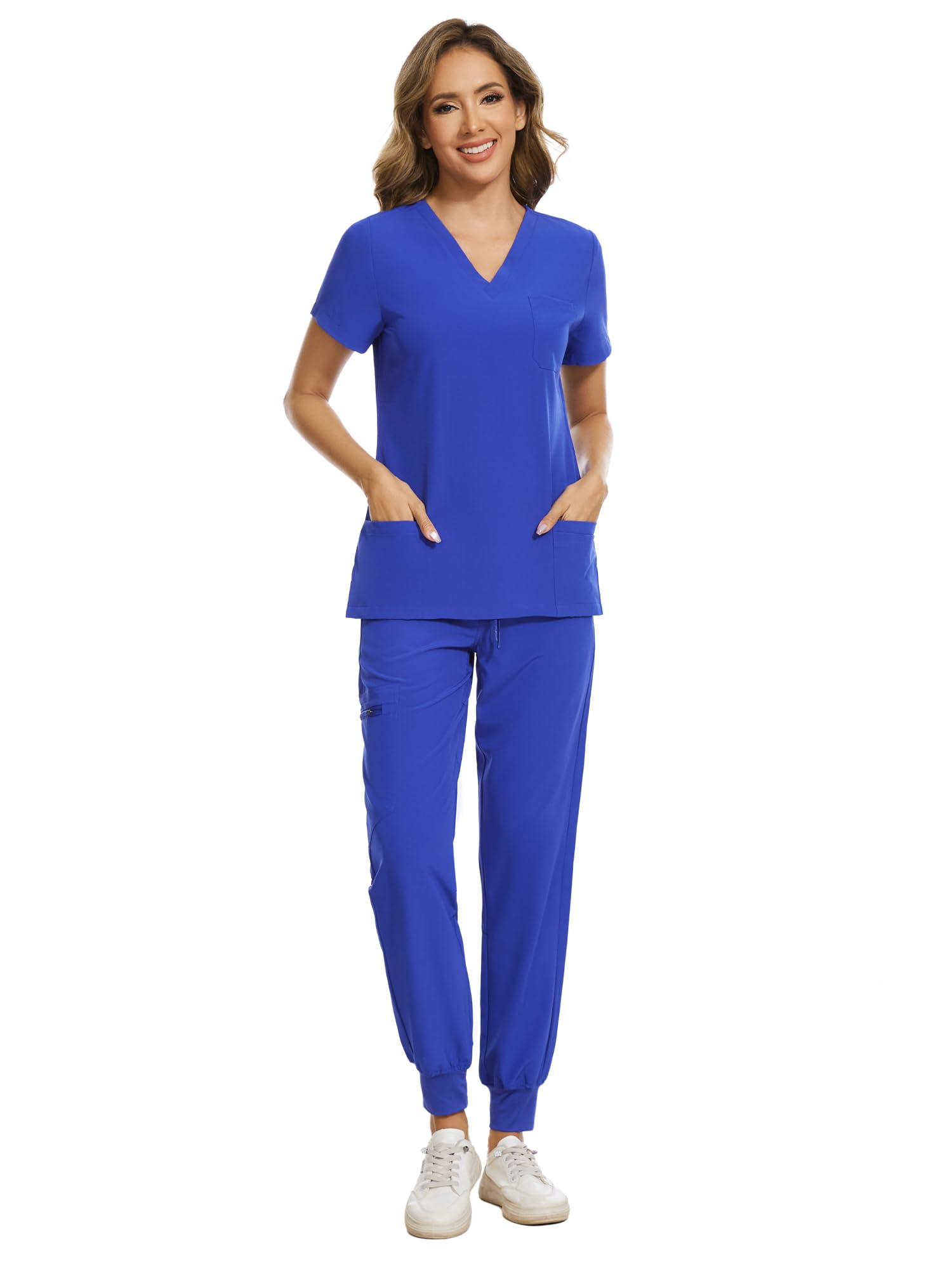 COZYFIT Women's Scrubs Set - Stretch V-Neck Top & Jogger Pant with 8 Pockets, Yoga Waistband, Anti Wrinkle, Slim Fit - Blueberry, XS, Tall