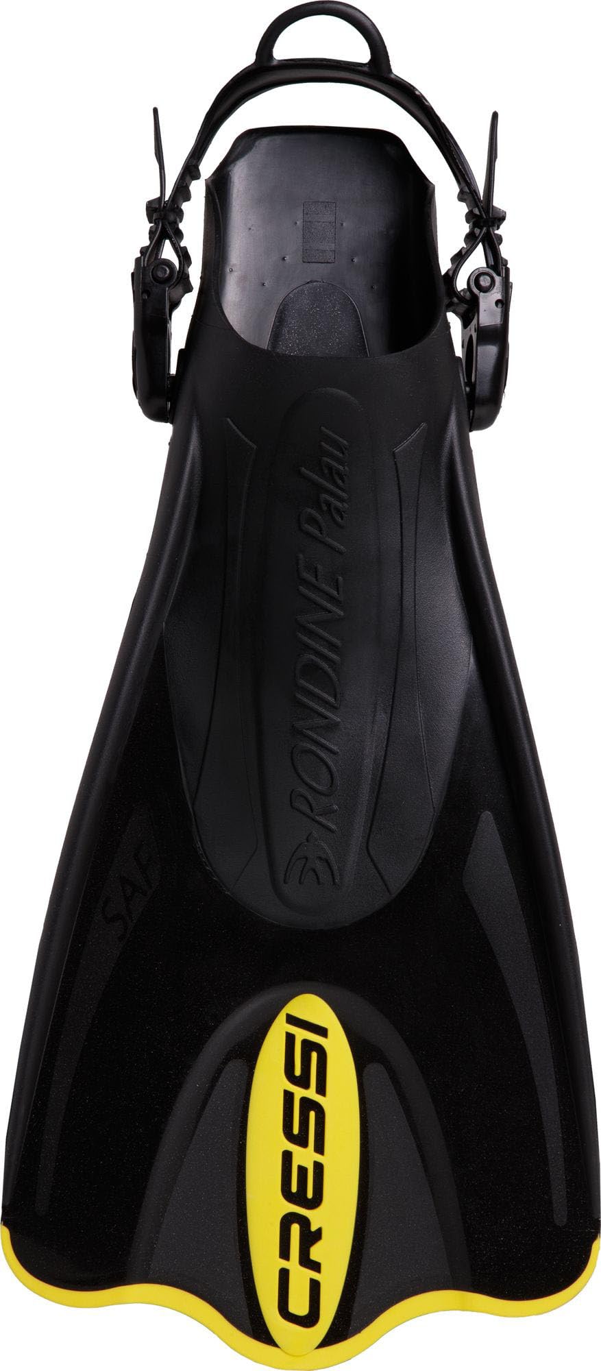 Details: The Palau short adjustable fin (SAF) opens the way for a new type of snorkeling and swimming fin. It has been designed for two specific purposes. The first was to have a foot pocket that could easily adapt to at least three or four consecutive foot sizes. This would enable the same fin to be used by all the members of a family, or by a group of friends. It would also make it great for rentals in a diving center or on a charter boat, without requiring an infinite number of sizes. The second purpose was to guarantee extreme comfort and an ease of fit in a strapped open heel fin even if it is to be worn barefoot. The result is a fin that is extraordinarily practical, that adapts to practically any foot size, and that allows for very quick fitting in any situation.The blade is made from a lightweight, yet responsive material that assures a fluid and effortless kick, yet at the same time quite powerful. The fin blade extends from the top of the foot pocket for maximum surface area. The strap has a strong pull tab ring to allow quick reversal of the strap for ease of donning and doffing or to clip the fins to the body or equipment. The fin pocket is made from a soft elastomer for added comfort. Thanks to their dimension, the Palau SAF are ideal for travel and commonly used for Swimming and Snorkeling. The Palau SAF is designed and manufactured in Italy by Cressi, an Italian brand pioneer in scuba diving, snorkeling and swimming equipment since 1946. The product is covered by a 2-year limited warranty.
