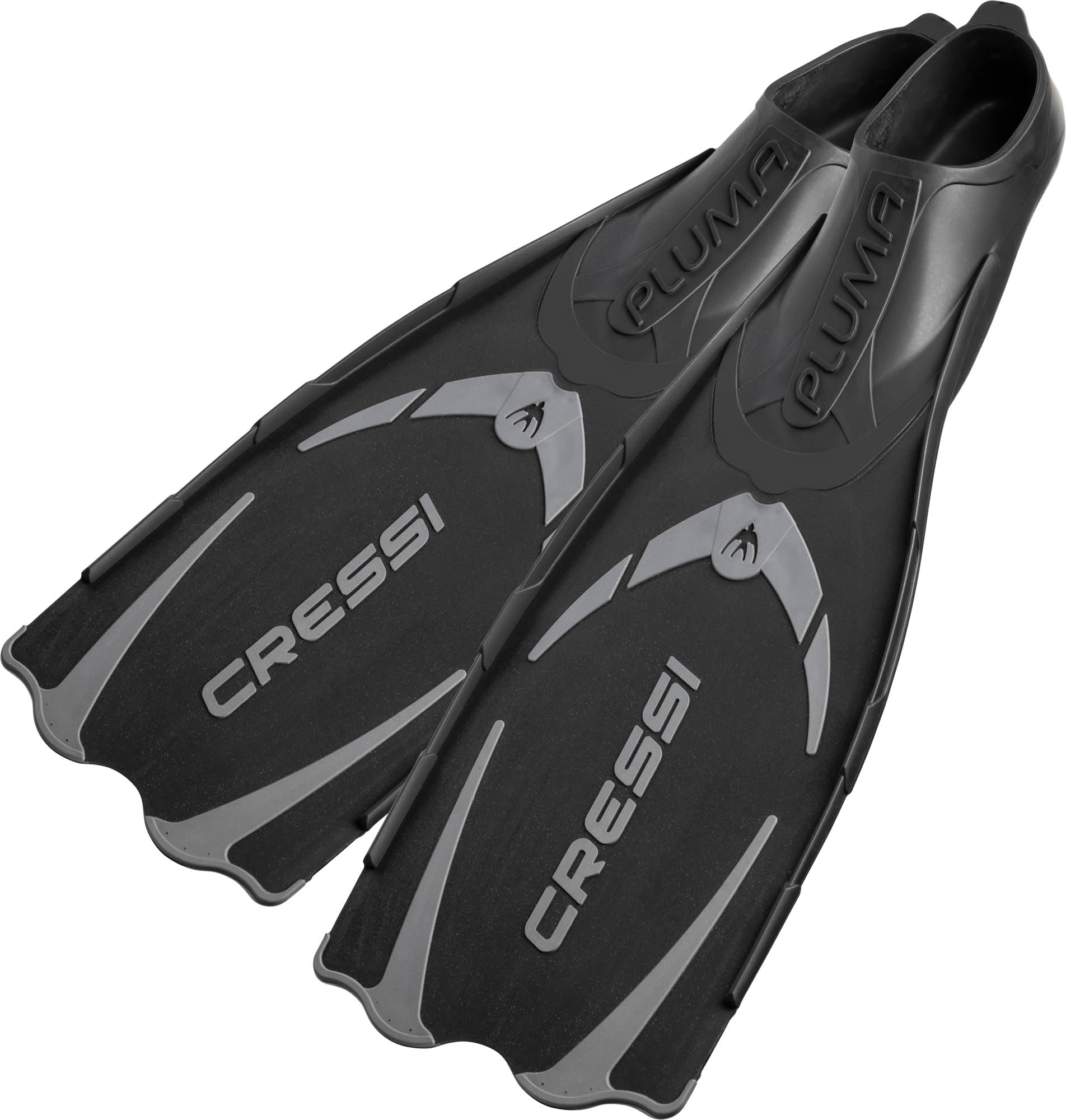The Pluma is an extraordinary fin that makes the most of molding technology previously used only on the Cressi hi-tech models designed specifically for free diving and scuba diving. The Pluma uses the same Cressi patented construction system of molding three different materials to give high performance, extreme lightness, easy fining, and comfort. The blade is made from light and reactive polypropylene. The blade is very-energetic and has snappy rebound. Two side supporting grooves and ribbing on the bottom of the blade allow progressive and controlled bending. The result is powerful, fluid and untiring kick. The foot pocket extends along the bottom of the blade to give protection during fining even in shallow water and near rocks. The foot pocket is made from soft thermo-rubber and the computer-designed shape offers great comfort as well as making the fins suitable for long use. The entire sole is made hard and comes with large non-slip inserts, for total protection of the foot and for excellent transmission of the leg-fin effort.