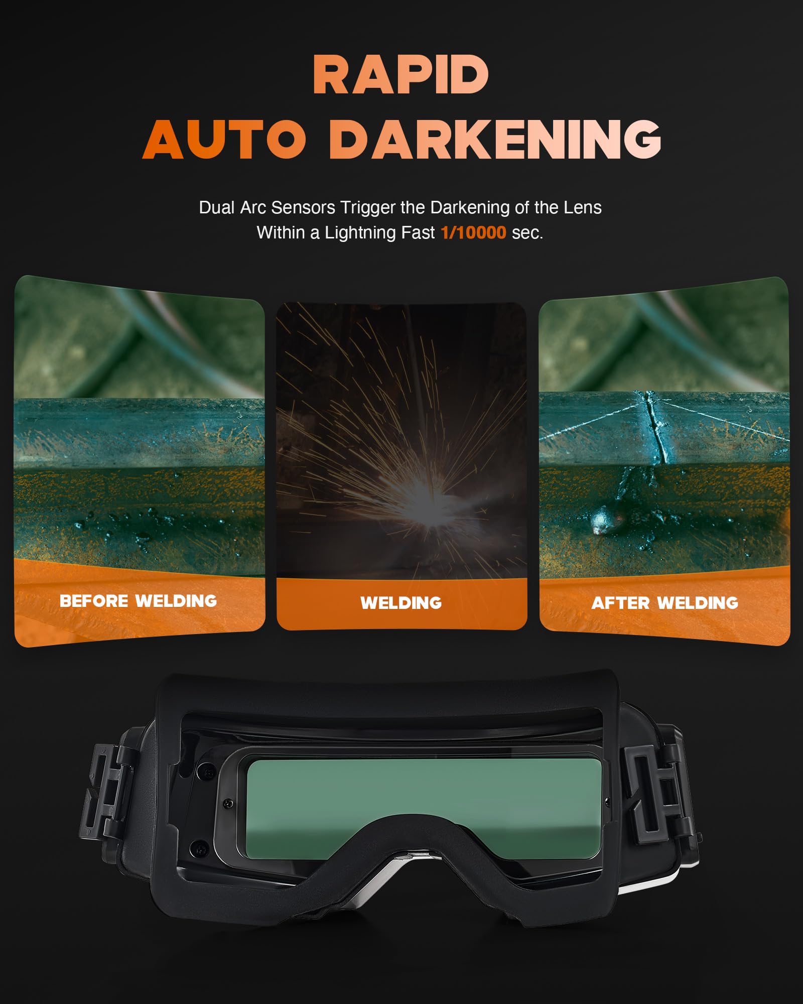 • WIDE APPLICATION: This self-tinting welding goggles is perfect for arc, TIG, and MIG welding and also offers cutting and grinding modes to more easily accommodate lighter shading as you work