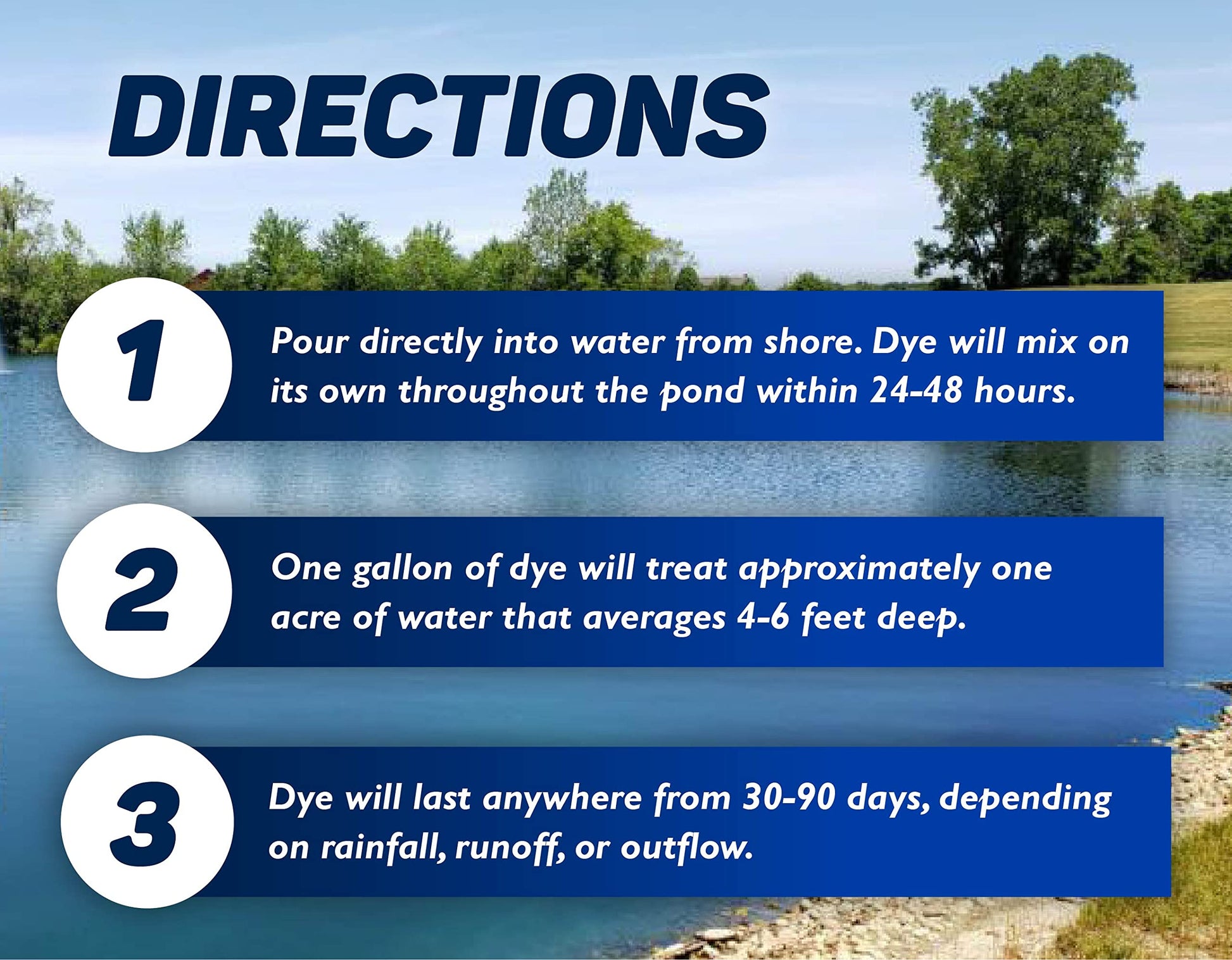 • We encourage pond owners trying a pond dye to take a picture before you apply the dye and then another picture the same time of the day 24-48 hours after applying the dye. It is amazing how subtly a dye can transform your body of water.