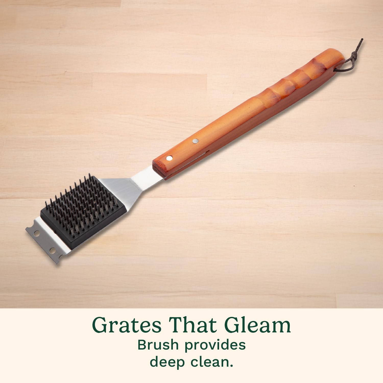 • COMPLETE BBQ TOOL SET: Includes an 18.5” spatula, 17.5” grill fork, 17.5” cleaning brush, 18” tongs, four stainless skewers, and four corn cob holders.