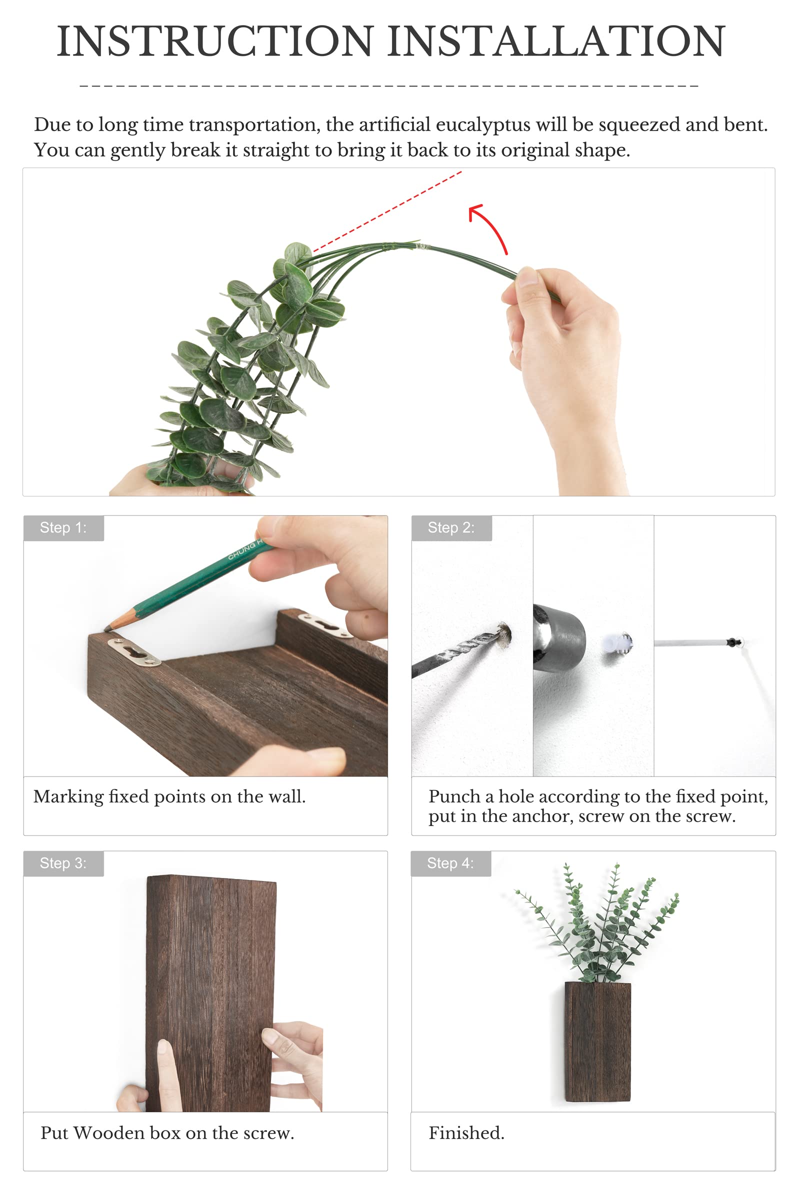 • Includes 2 wood planters measuring 5.1'L x 1.4'W x 9.4'H and 2 bunches of 16.5' fake eucalyptus sprigs (Gently reshape any foliage that's squeezed during shipping)
