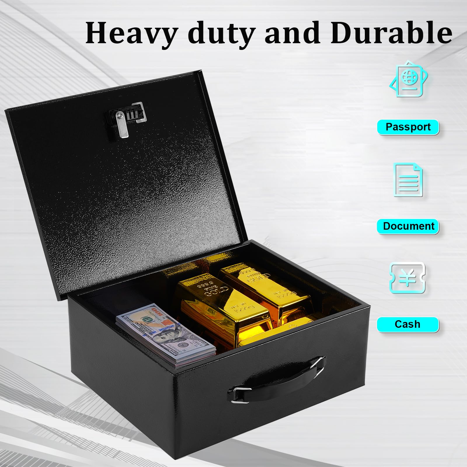 • 【LARGE CAPACITY】The interior dimension of the lock box for documents is 11.8” x 9.65” x 4.53”. It is perfect size to protect important stuff such as cash, documents, hard disks, passports, jewellery, etc.
