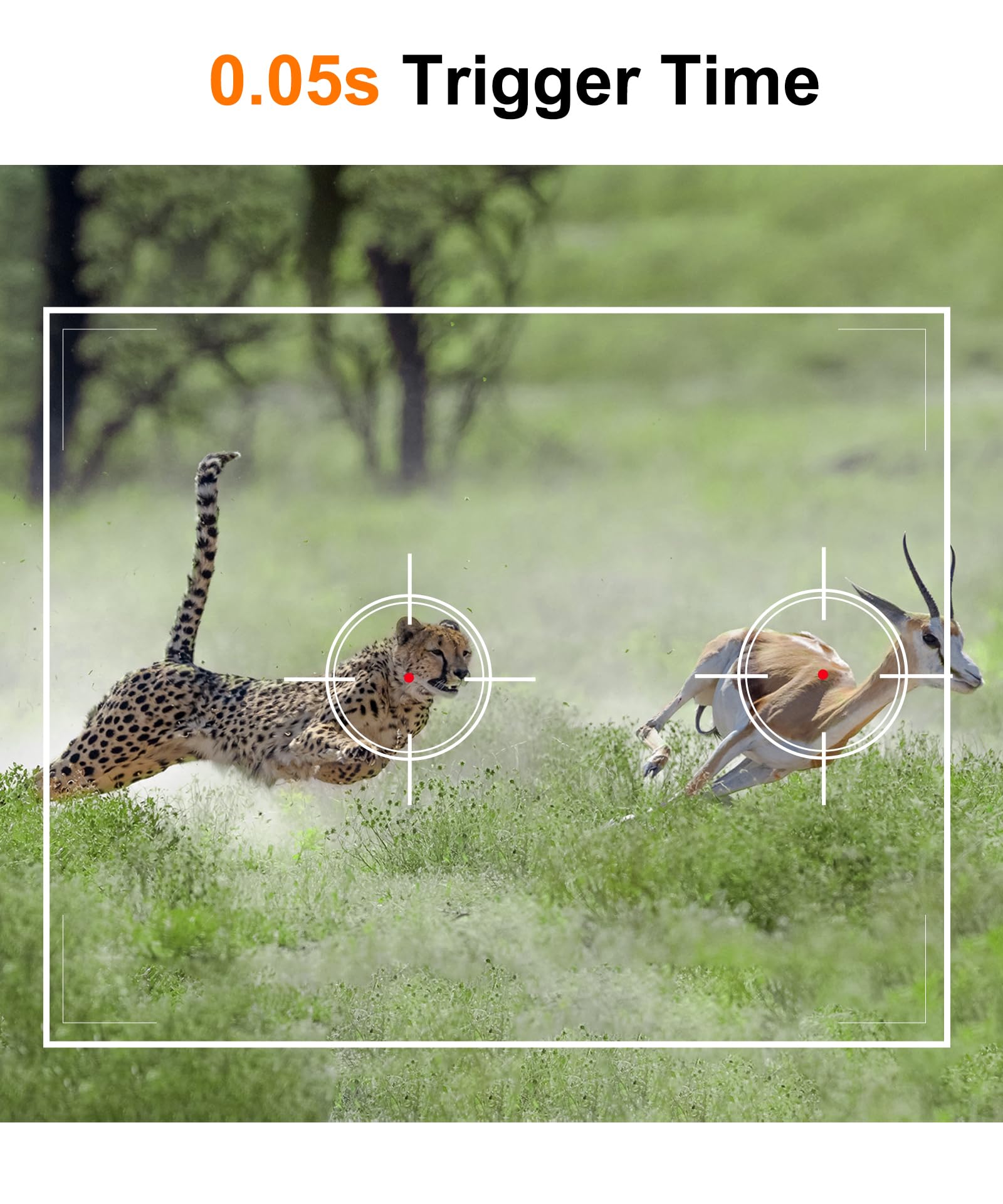 • Long Distance Fast Trigger: Hunting camera trigger time of only 0.05-0.3S, PIR distance of up to 1-98 FT,Once the moving target enters the PIR scanning range, it will trigger the camera to take pictures as fast as possible, so you won't miss any exciting moments