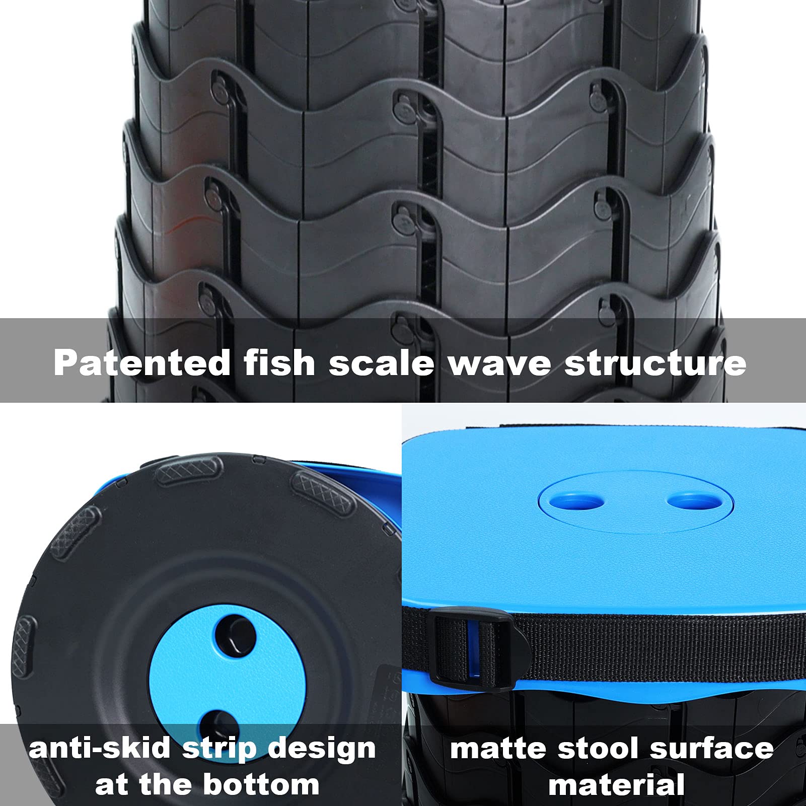 • U.S. DESIGN PATENT : Patent No. D873,042S, this fish scale structure makes folding stool more closely to ensure safety. Together with non-slip base ensures safety and stability.