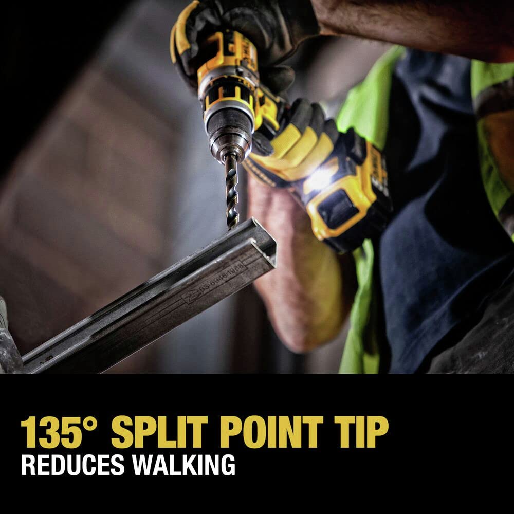 Details: The DEWALT Black & Gold Metal Drill Bits feature a black and gold coating for preventing rust. The tapered web design provides extreme durability to resist breakage. The bits feature a 3-flats shank to reduce spin-out in the chuck. The Black & Gold metal drill bits are made of heavy-duty High Speed Steel for drilling into a variety of materials including plastic, wood, and metal. Each bit features a 135 split point tip design to help reduce walking.