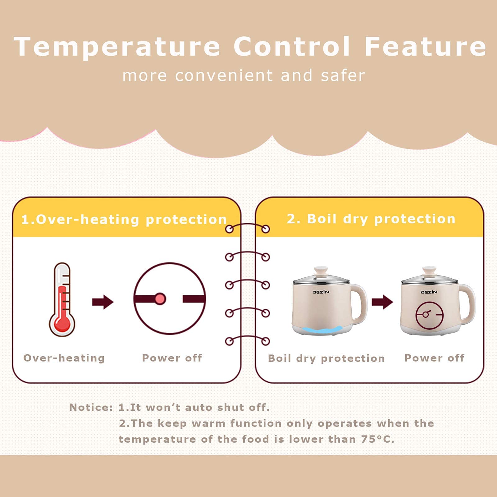 • We take care of your safety - Equipped with keep warm function (this function will work repeatedly to stabilize the temperature between 75 °C to 80 °C, which means only if the temperature is lower than 75°C, it will operate, and when the temperature is higher than 80°C again, the function will turn off itself), over-heating protection and boil dry protection. Including 100% stainless steel interior and stain-resistant glass cover, with double wall construction, more convenient and safer.