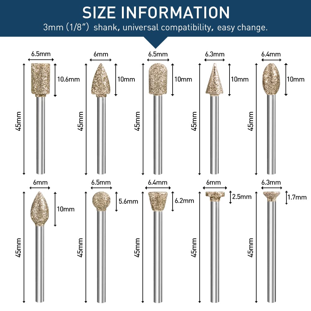 • 【3mm(1/8') shank】: Diamond grinding burr drill bits set fits for most drills, rotary tools or die grinders. High compatibility, easy change
