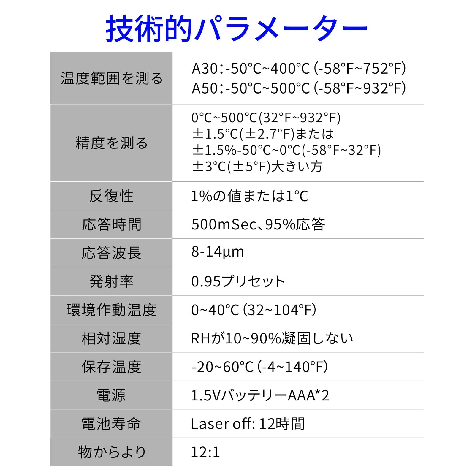 • Temperature measurement range:-50℃-500℃ (-58℉-932℉)Display resolution: 0.1 ℃ or 0.1 ℉