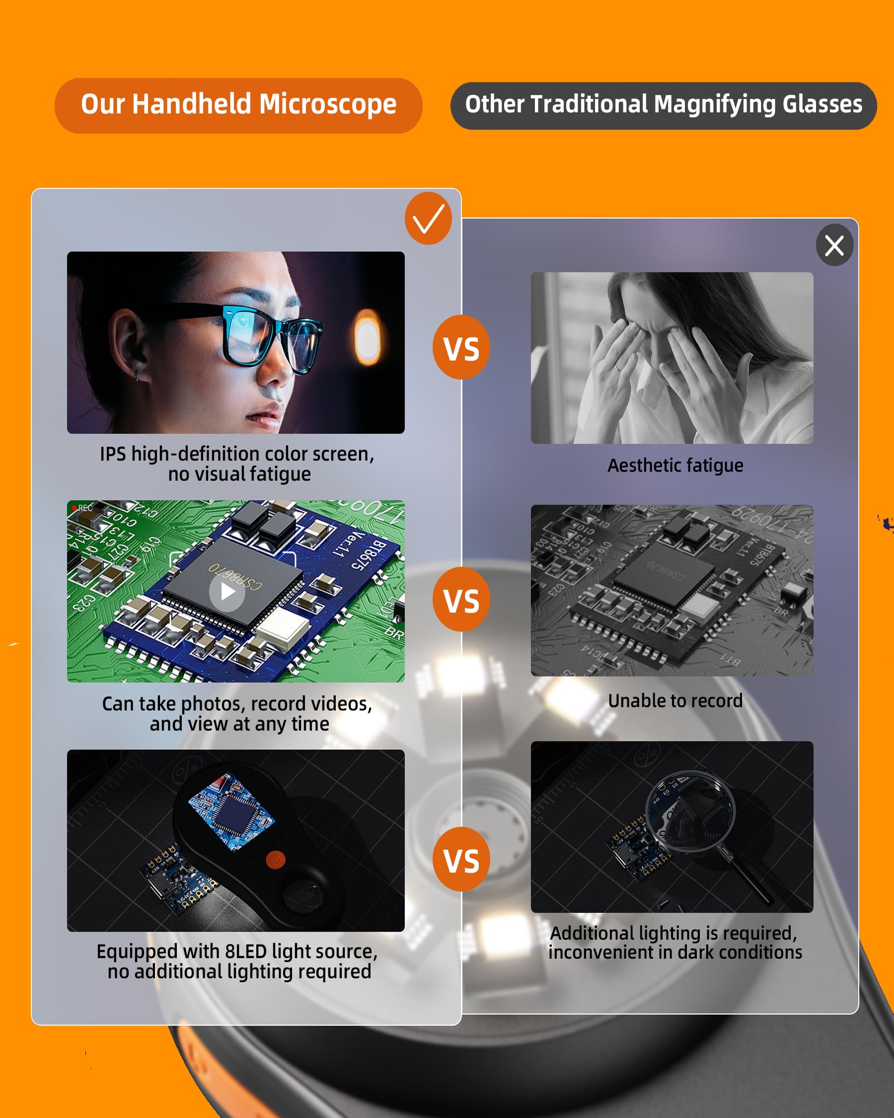 • 200W high definition pixels: 1980x1080P, with 2.0 inch IPS color high definition screen, realistic colors, 178 ° visual angle. Compared to traditional magnifying glasses, this microscope does not shake the eyes and reduces eye fatigue.