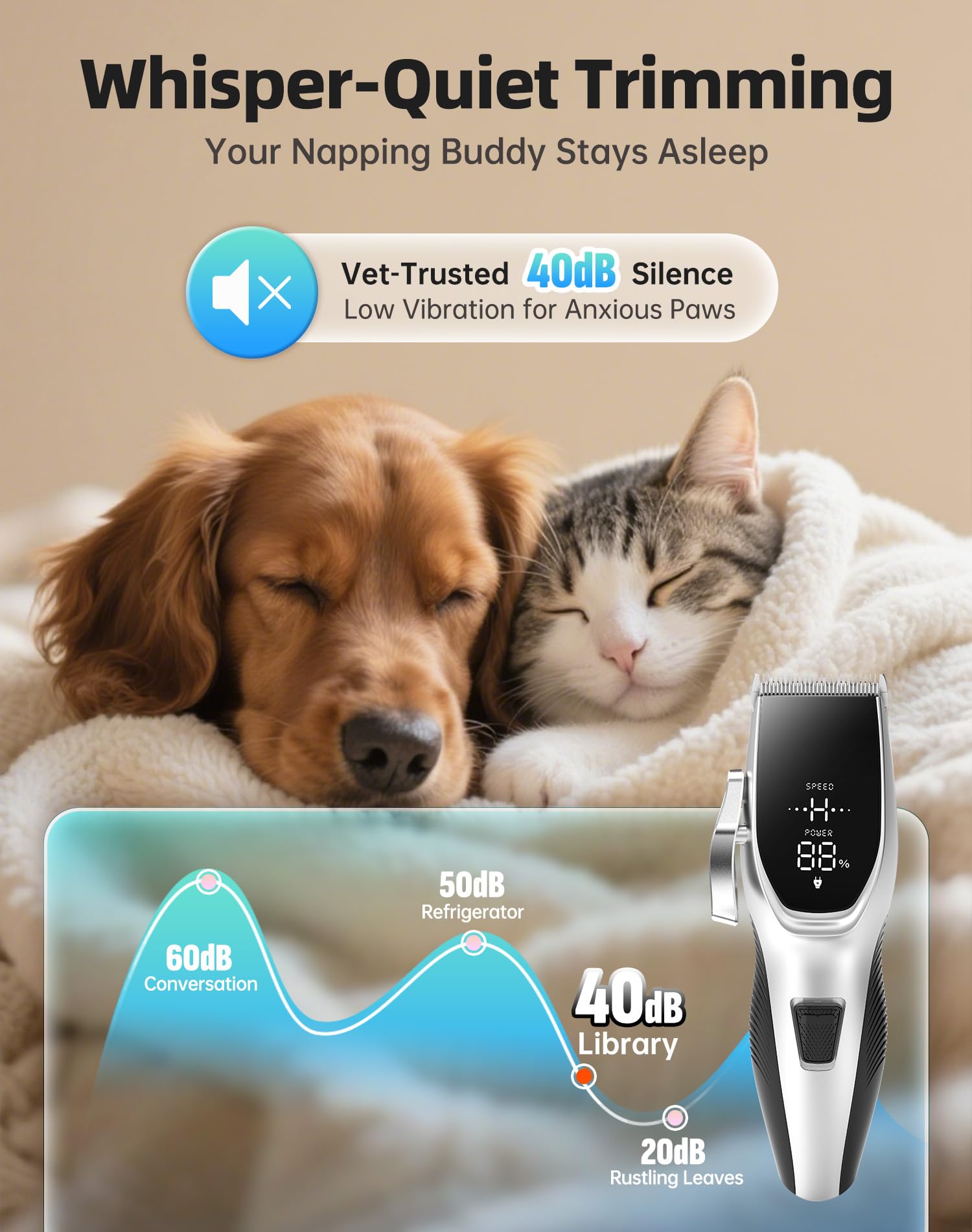 • Ultra-Quiet & Low Vibration Design:Experience the joy of home hair grooming with the OCPEET professional dog grooming kit.Featuring an advanced, powerful motor that operates quietly below 50dB and is ergonomically designed for a comfortable grip with minimal vibration. Perfect for even the most sensitive pets, ensuring they remain calm and unafraid. This sets a new benchmark for silent hair grooming and is ideal for pets with a sensitive disposition. Let your furry companions enjoy a stress-free grooming session in comfort