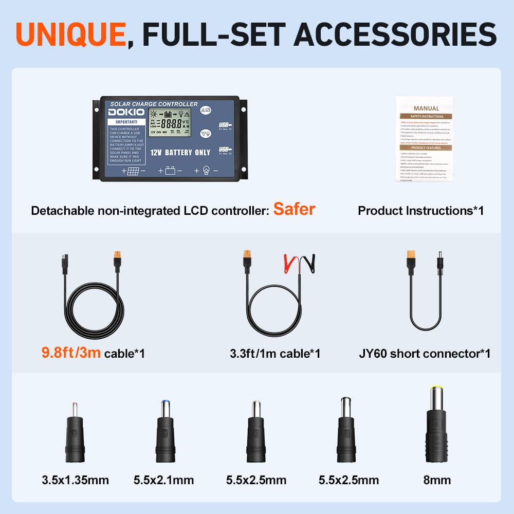 • 【PERFECT CHOICE FOR OUTDOOR AND EMERGENCY LIFE】-- 9.85ft (3m) cable length from panel to controller, For most power stations (Jackery,Goal Zero,Ecoflow,Paxcess) and 12-volt batteries(AGM,LiFePo4,Deep cycle batteries),RV,car,boat,trailer,truck,pumpa,camping,van,emergency power