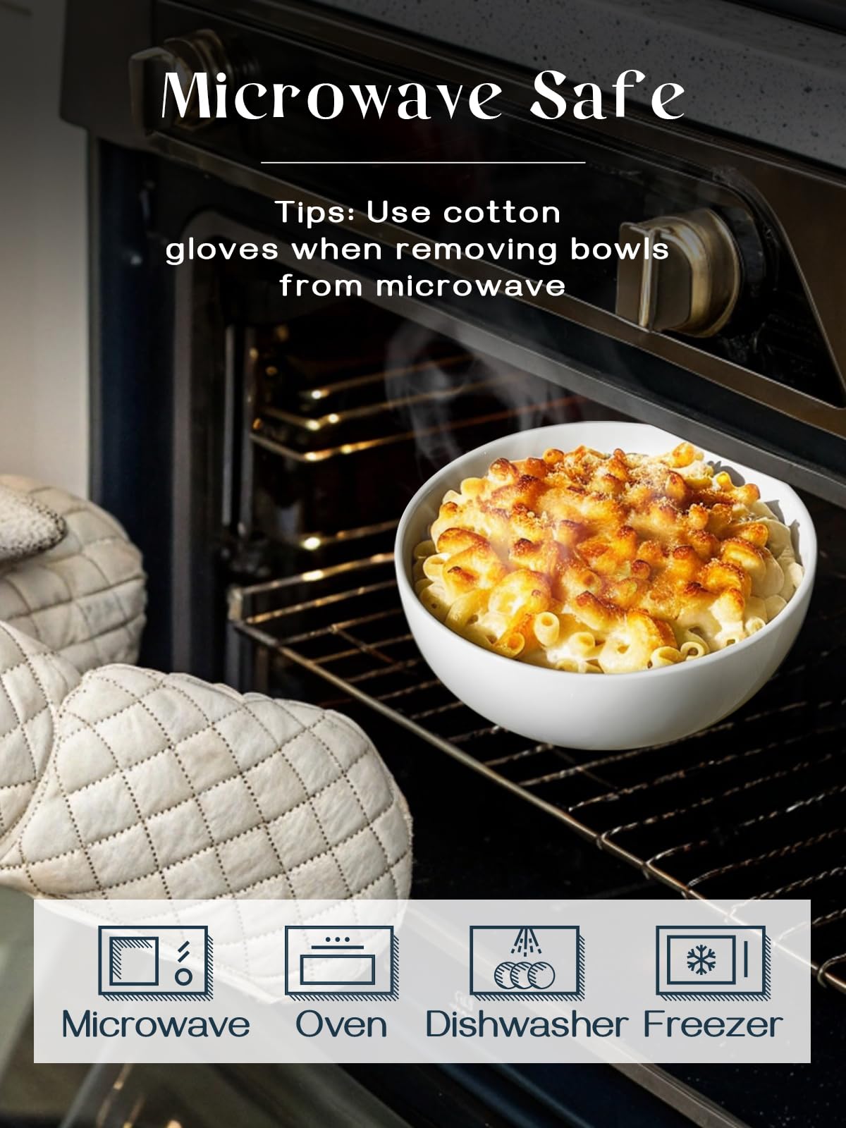 • Easy to Store and Clean: Effortlessly stackable and free up enough space for other dining sets in the kitchen cabinet and match most existing dinnerware. The smooth and anti-scratch glazed interior is easy to clean. They can take the heat, whether it be in the dishwasher, microwave, freezer or oven.